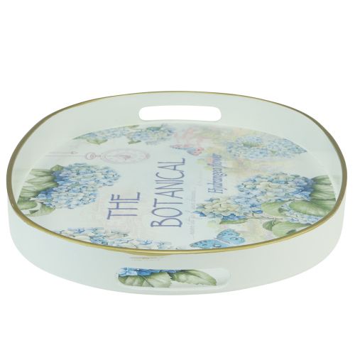 A kék hortenziáké a főszerep, de a háttérben a Provence-i tájak és a pillangók is élénkítik a fehér dísztálcát. A szélébe két praktikus fogantyú került. Az ovális tálca kialakítása formáját tekintve modern, motívumában pedig gyönyörűen retro.