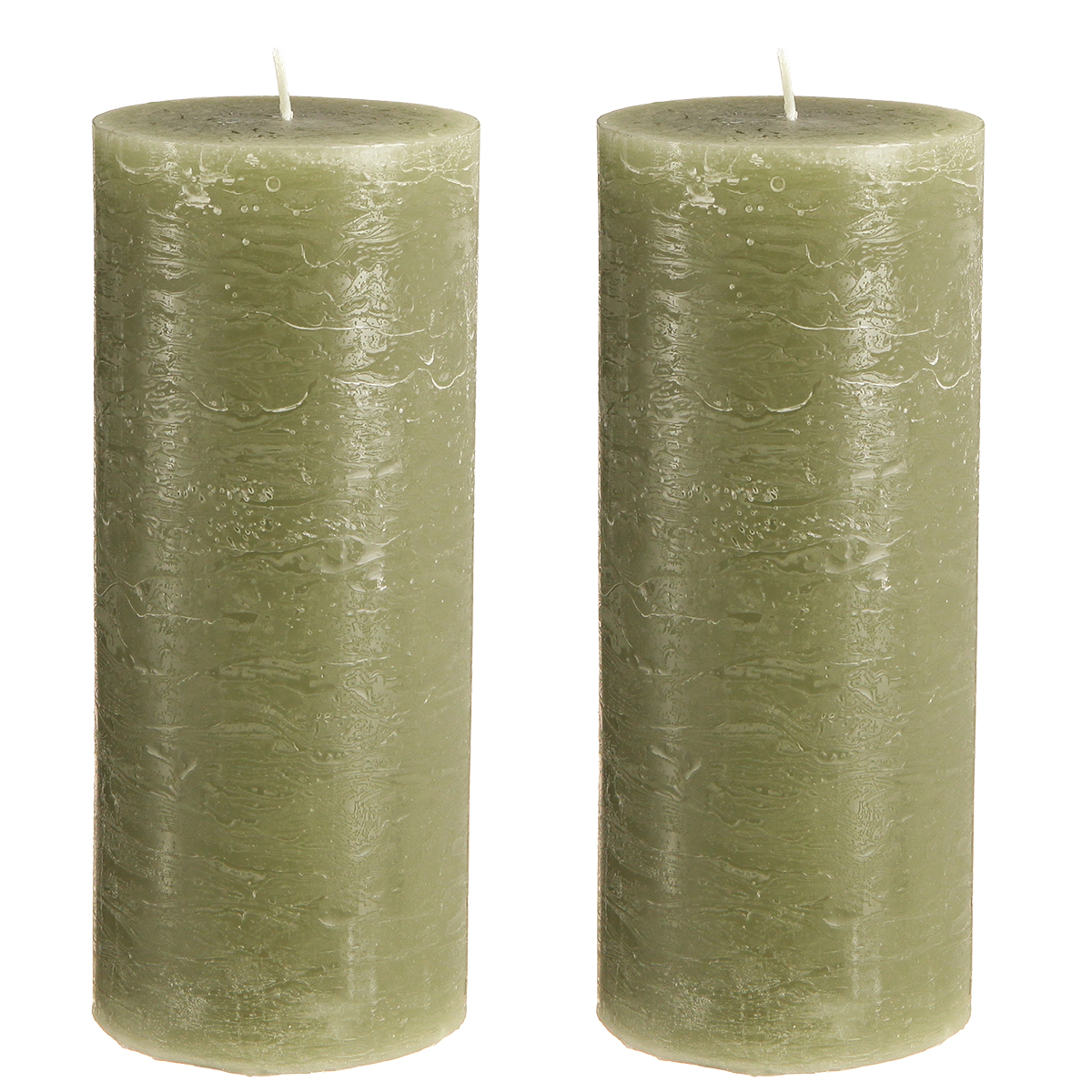 2 db nagy olívazöld oszlopgyertya szett, dekoratív gyertyák asztaldíszítéshez és otthoni hangulat megteremtéséhez, 85x200 mm, hosszú égési idő