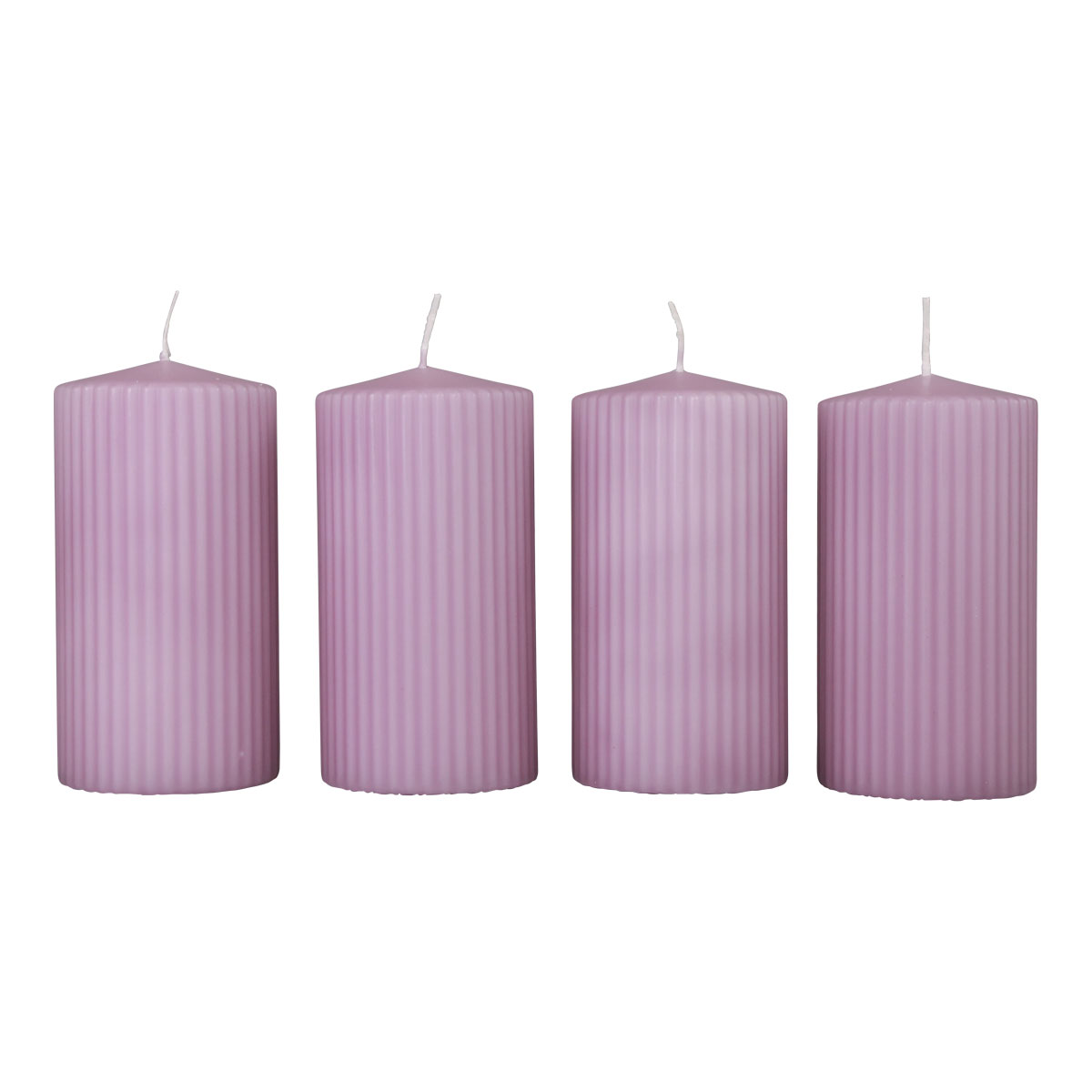 4 oszlopos gyertyakészlet, barázdált díszgyertyák, 70/130 mm lila színben, asztaldísznek, adventi koszorúknak és tavaszi virágdíszeknek