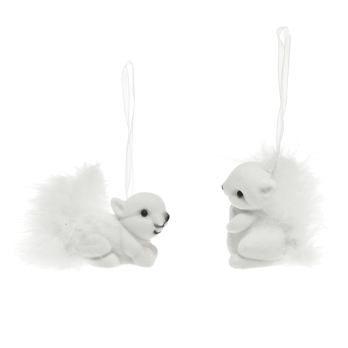6 cm-es fehér mókus bűbáj csillogó és tollas részletekkel – tökéletes ünnepi karácsonyfadíszítéshez – 2 darabos csomag
