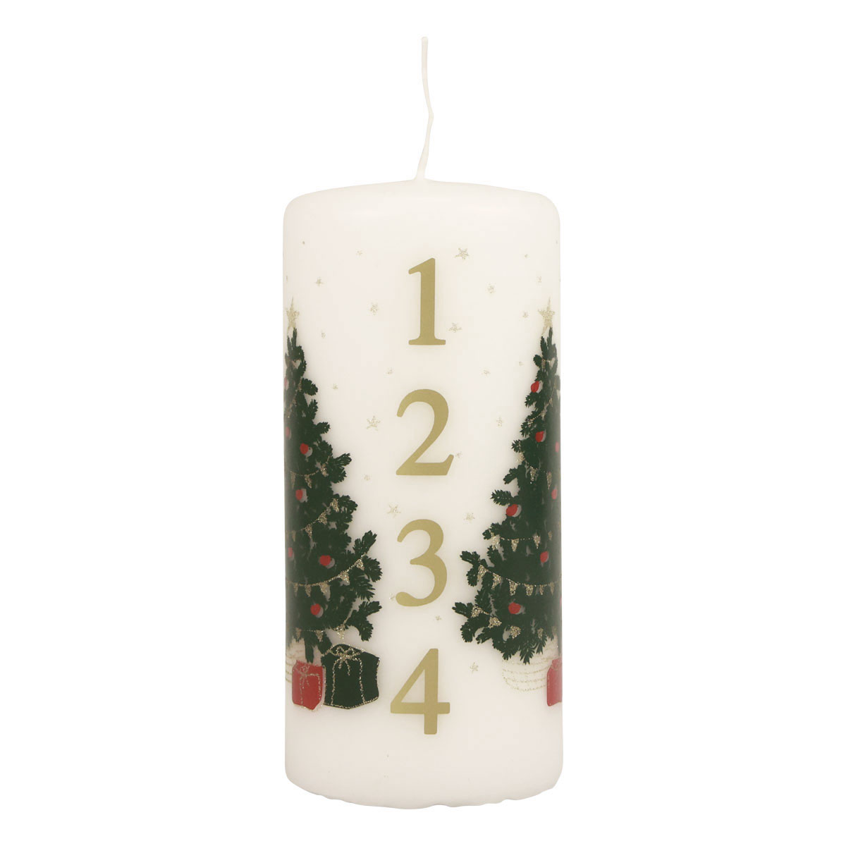 Adventi naptár gyertya, karácsonyi oszlopgyertya, fehér, 150/65mm, számokkal és karácsonyfával
