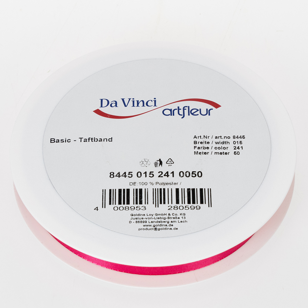 A rózsaszín ajándék és dekorációs szalag körülbelül 15 milliméter széles és körülbelül 50 méter hosszú. 100% poliamidból áll, és műanyag orsón szállítjuk.