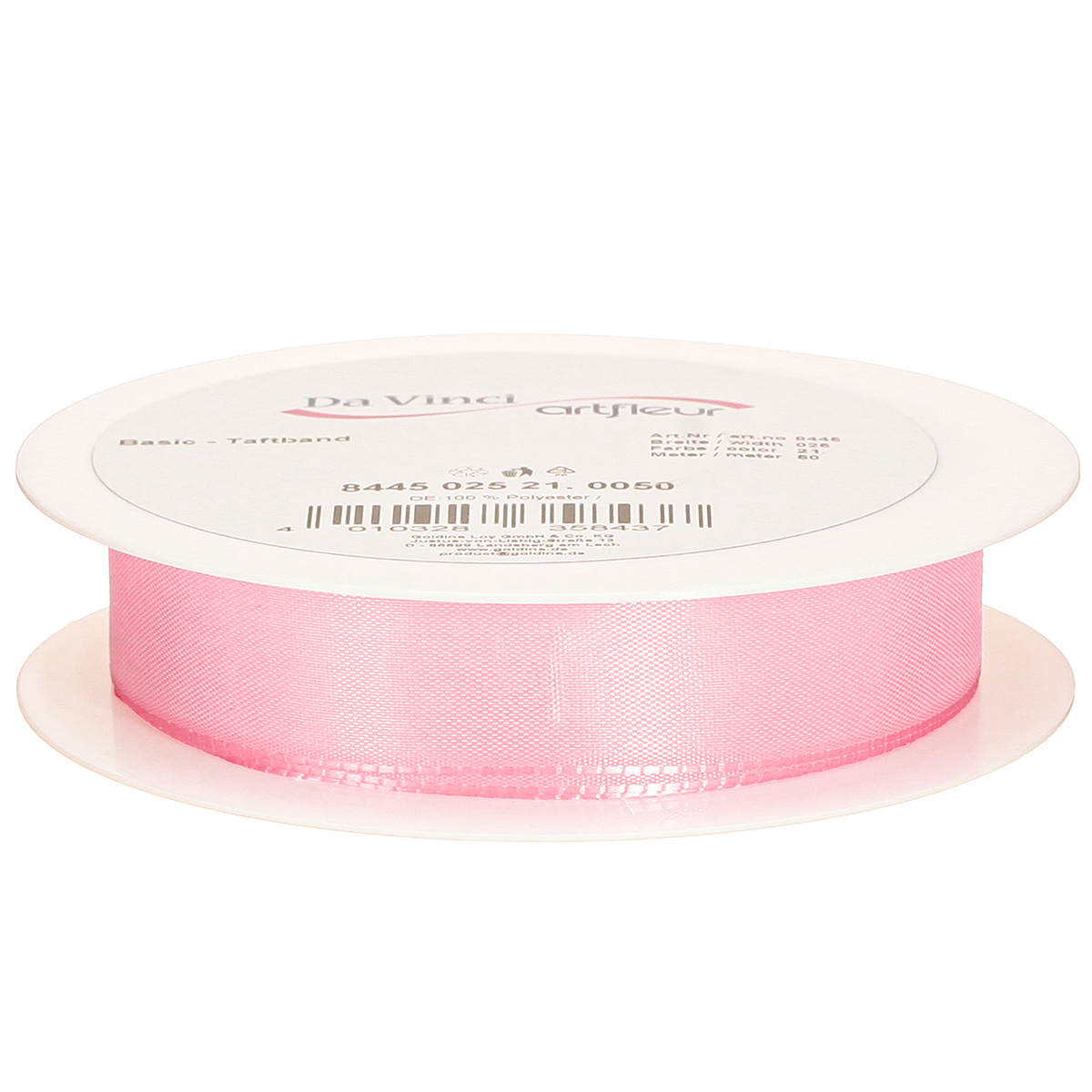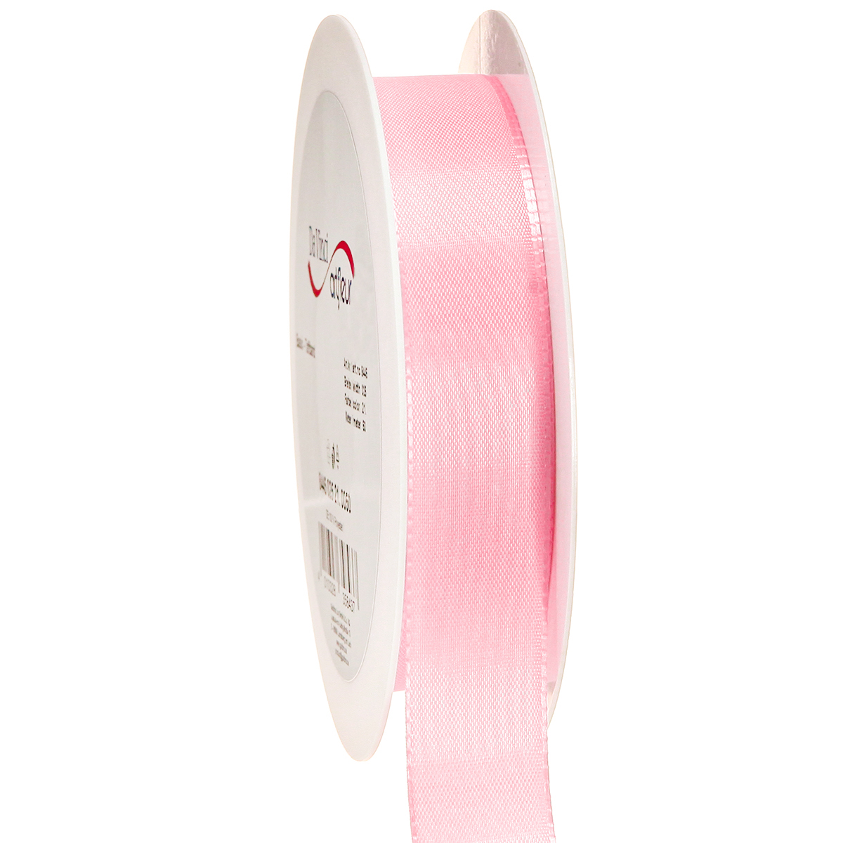 A világos rózsaszínű ajándék- és díszszalag körülbelül 25 milliméter széles és körülbelül 50 méter hosszú. 100% poliészterből készült, és egy praktikus műanyag orsóra van feltekerve.