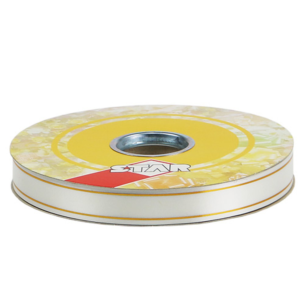 A kartonból és műanyagból készült orsón szállított fehér és arany színű ajándékszalag 100% polipropilénből készült. Körülbelül 19 milliméter széles és körülbelül 100 méter hosszú.