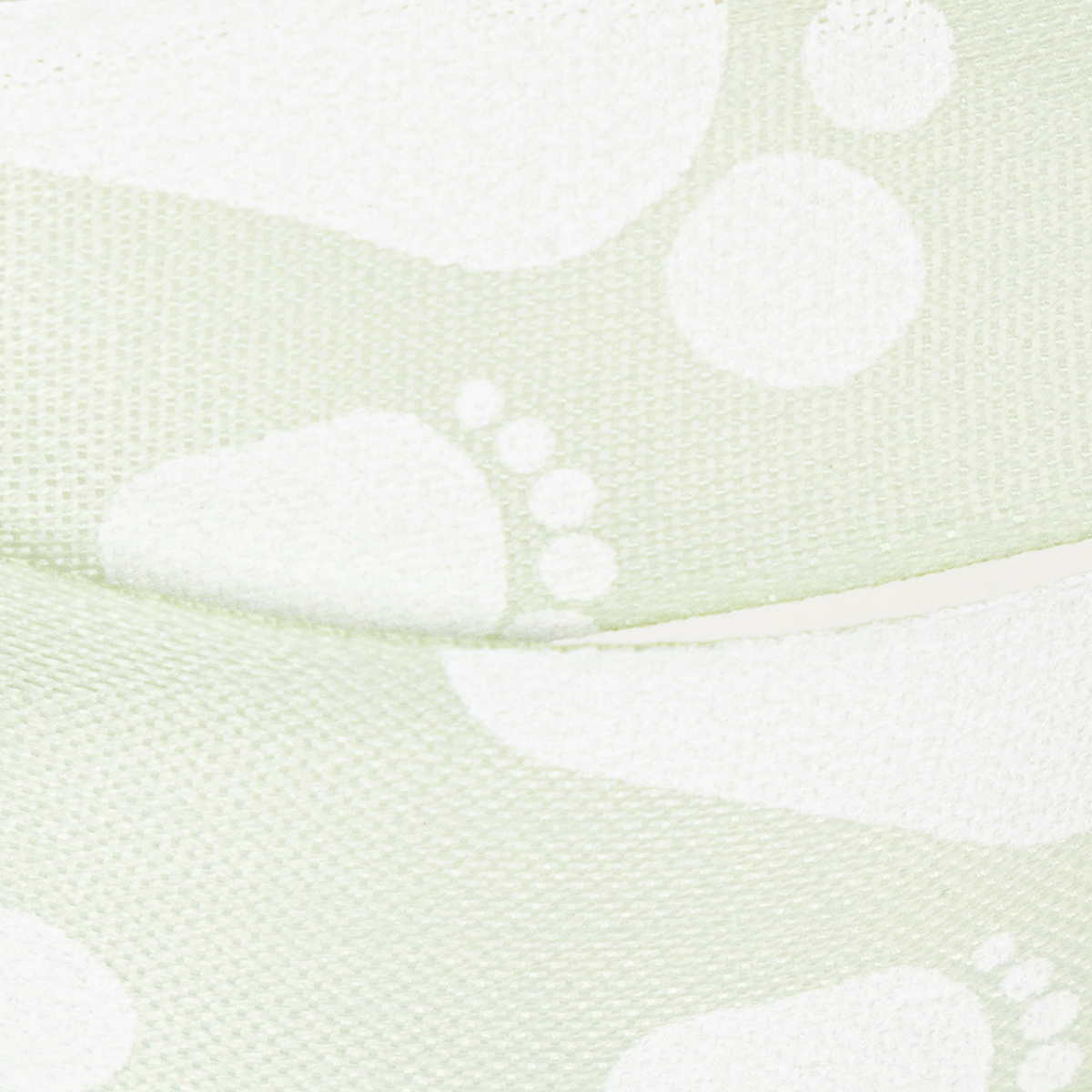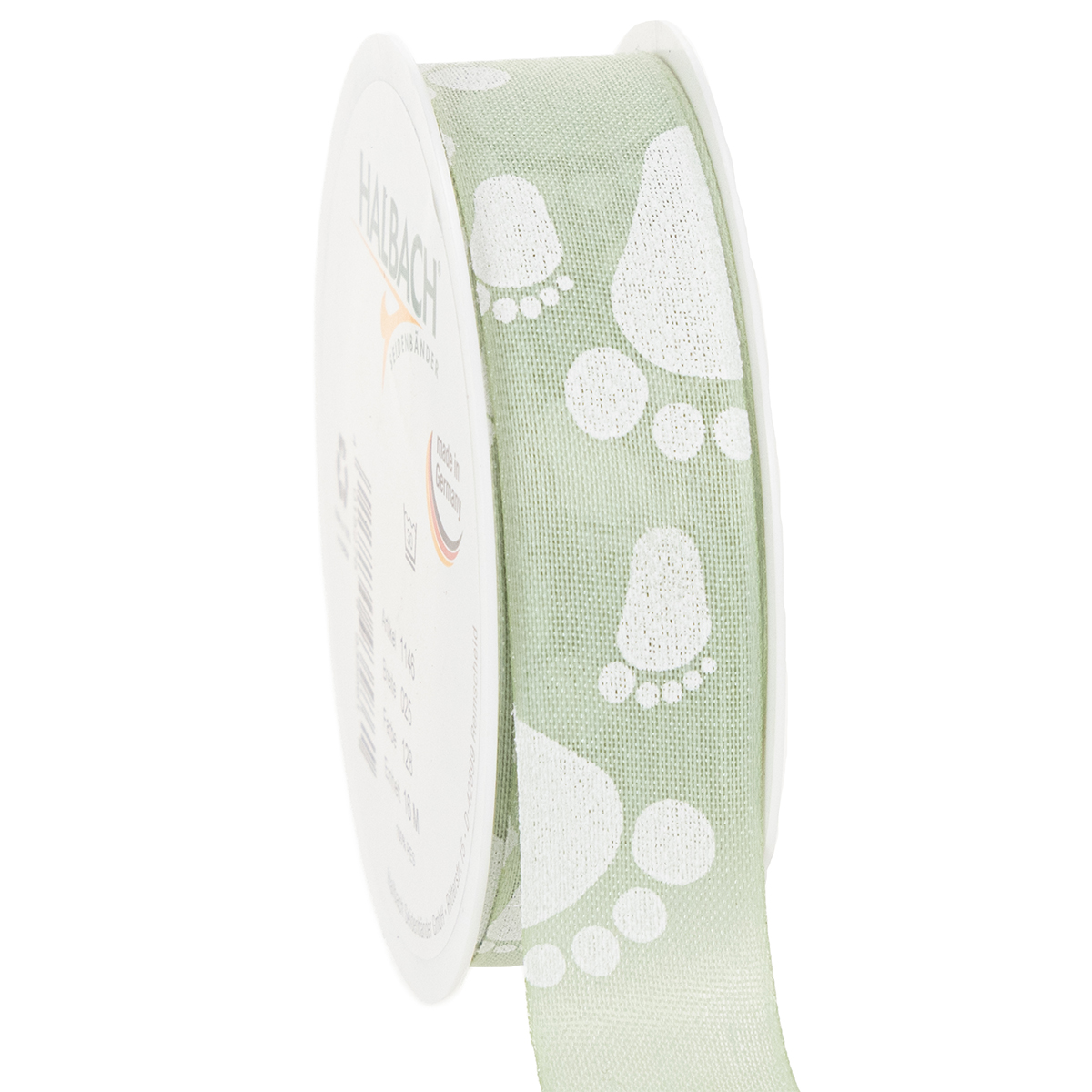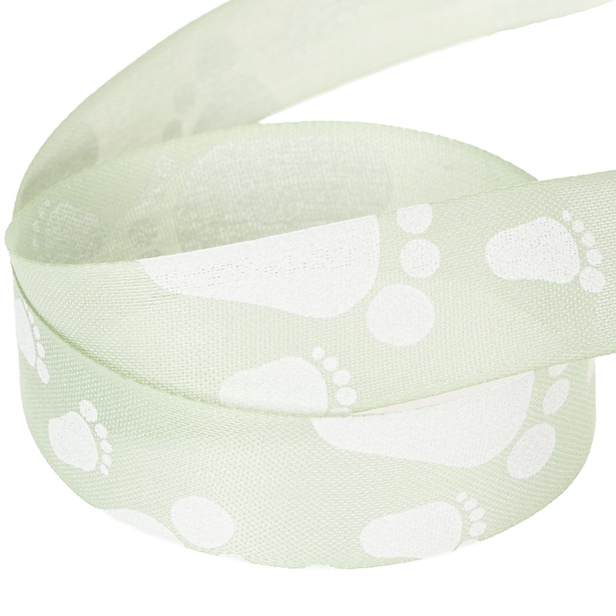 A szövetszalag világos, pasztellzöld hátterét kisebb-nagyobb lábnyomok díszítik. A fehérben a baba lábak gyönyörű kontrasztot alkotnak a dekoratív szalag színével, és ügyesen ragadják meg a boldog esemény témáját.