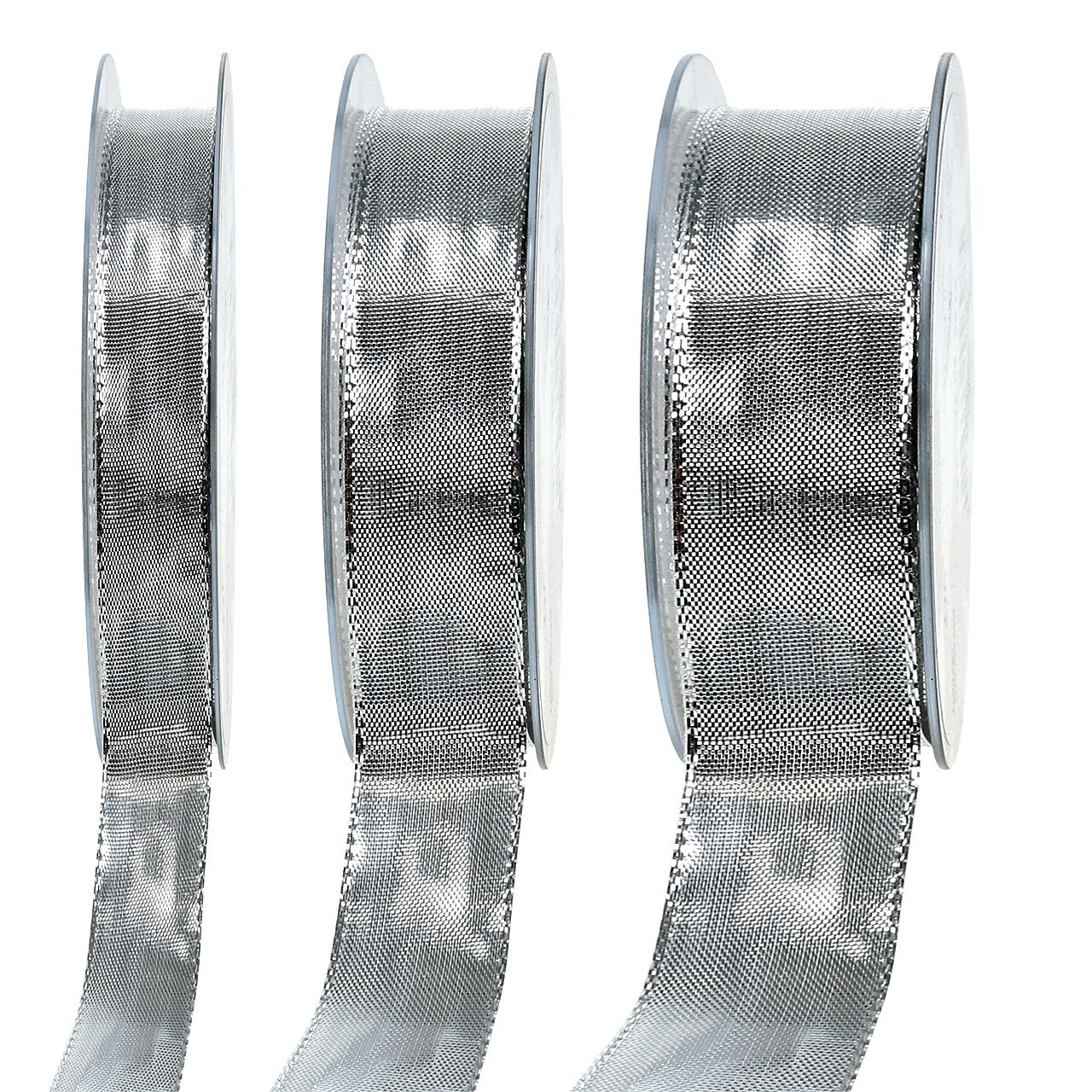 Mindegyik ezüst színű, drótszegéllyel ellátott ajándékszalag körülbelül 25 méter hosszú, poliészterből és poliamidból készül. A robusztus szalagot műanyag orsókon kapja meg, amelyek normál adagolókra is felhelyezhetők.