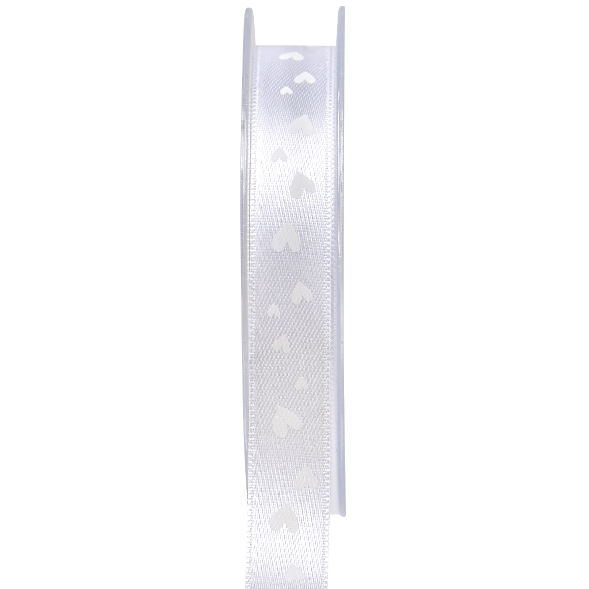 A poliészter szalag selymes fehéren ragyog, és romantikusan nyomtatott fehér szívecskékkel. Az öntött élek kiegészítik a dekoratív szalagot és további stabilitást biztosítanak.