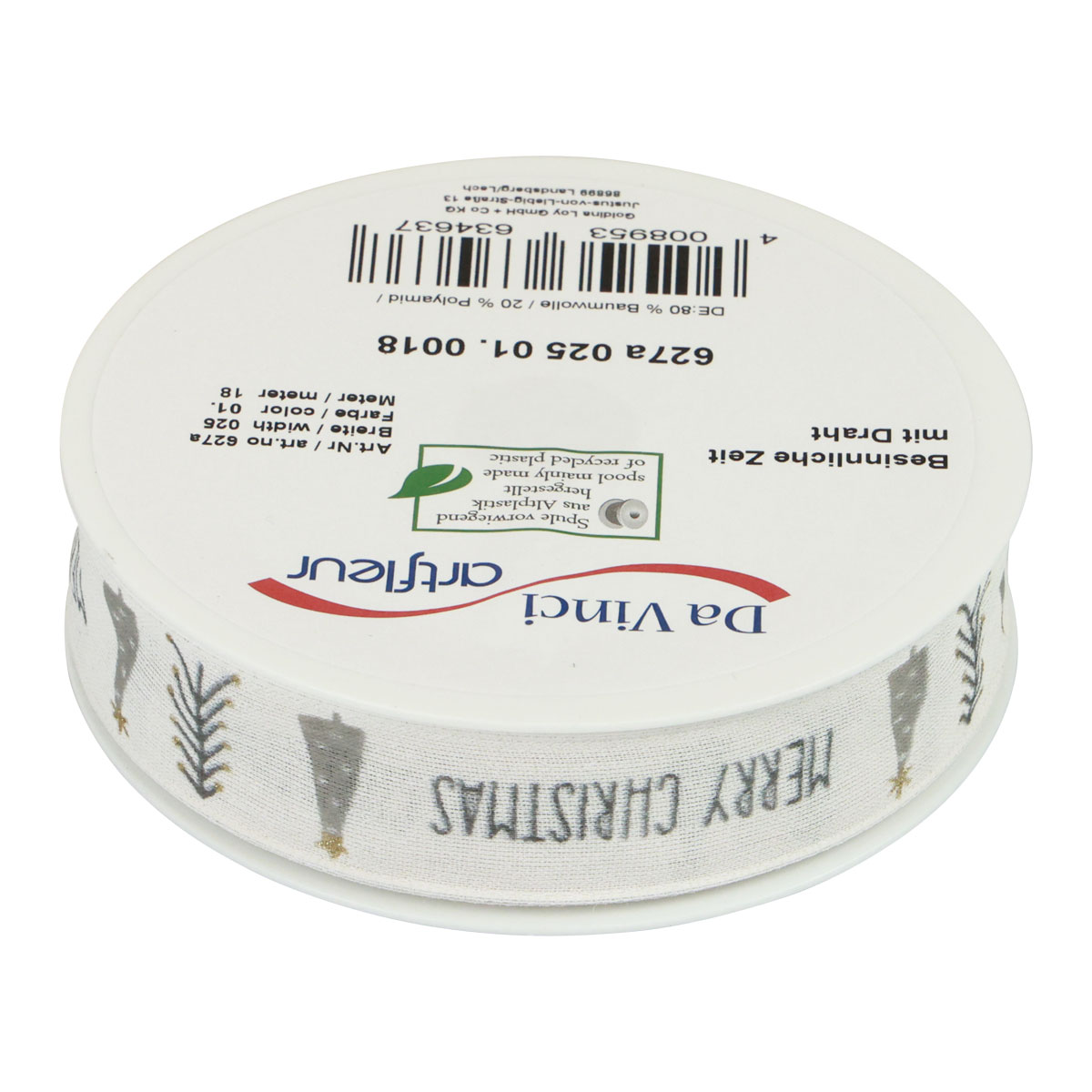 A szövetszalag többnyire pamutból készült, és a széleken található finom drótnak köszönhetően rendkívül stabil ajándék szalagként. Ezüstszürke karácsonyfák aranyszínű részletekkel a feliratok közötti fehér szalagot is díszítik.