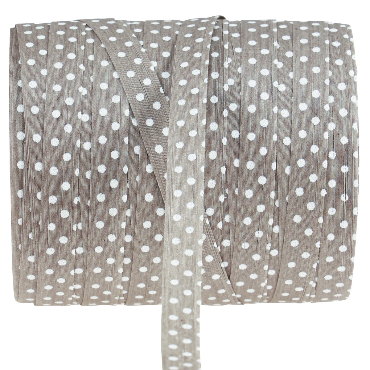 A teljes egészében pamutból készült pánt lenyűgöz aranyos fehér pöttyeivel és időtlen barna színével. A szalag nem tekerhető, de ajándékcsomagokon és környezettudatos csomagoláson nagyon stílusosan mutat.