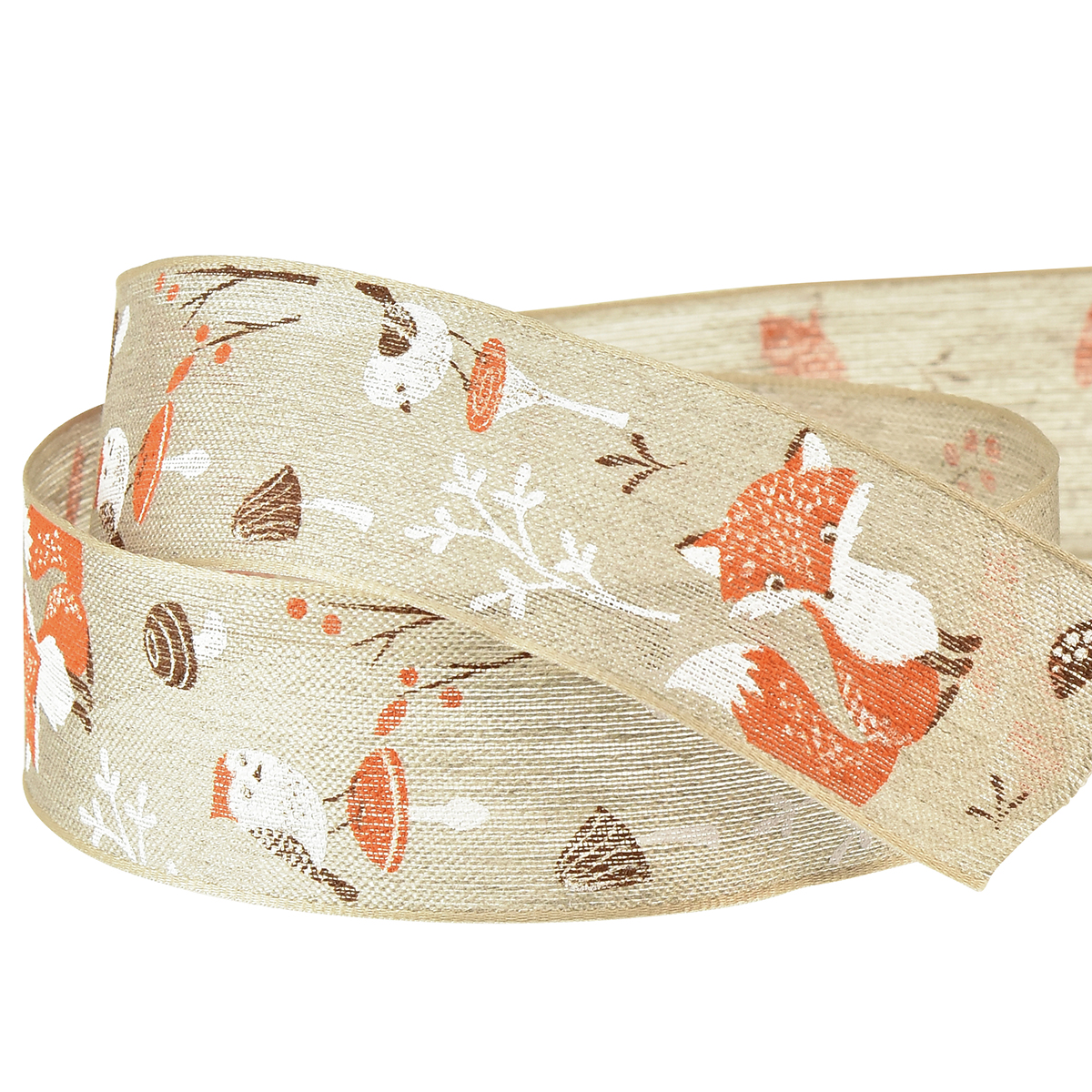 Termék neve: Ajándék szalag ősz rókával és gombával lenszürke 40mm 15m