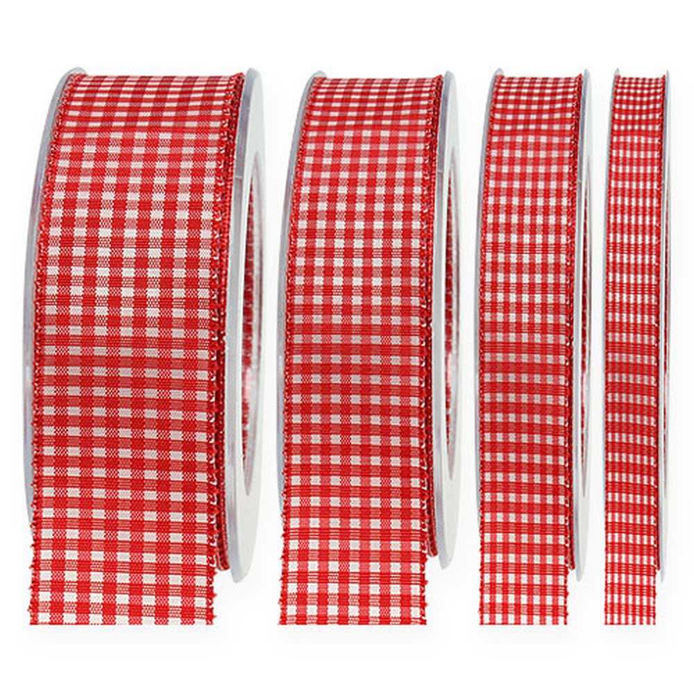 A piros kockás, szegélyezett ajándékszalag hossza körülbelül 20 méter, és műanyag tekercsre van feltekerve. A jobb felső sarokban rugalmasan választhatja meg a szélességet, és a megfelelő szalagot az elképzeléséhez igazíthatja.