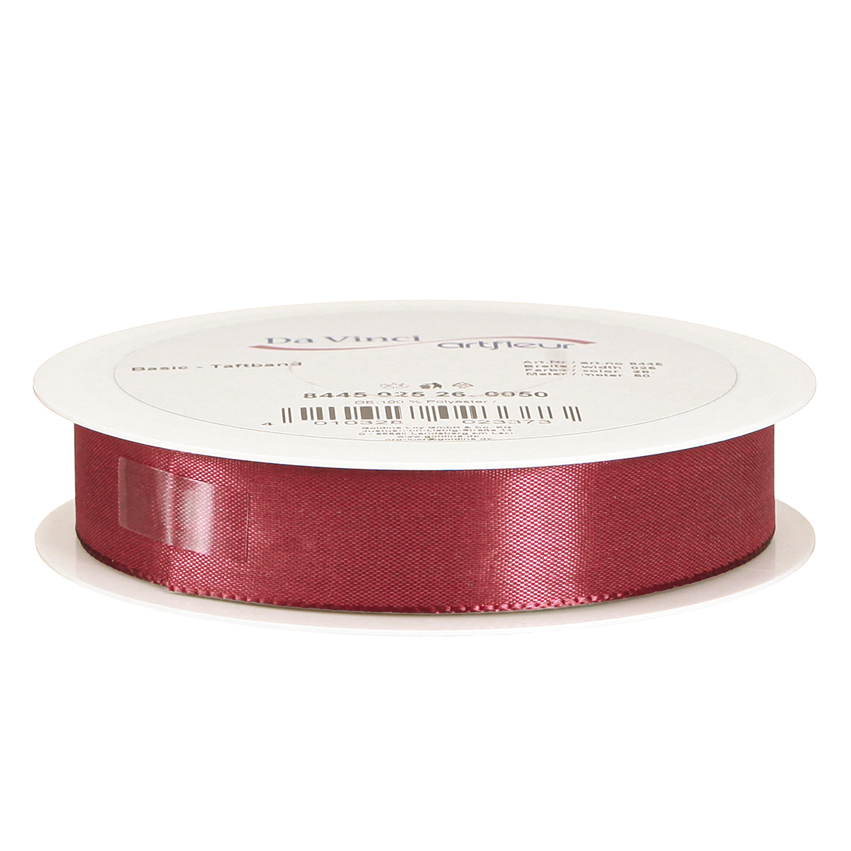 A körülbelül 25 milliméter széles és körülbelül 50 méter hosszú, 100% poliészterből készült bordói ajándékszalagot egy praktikus, lapos műanyag orsón szállítjuk ki.