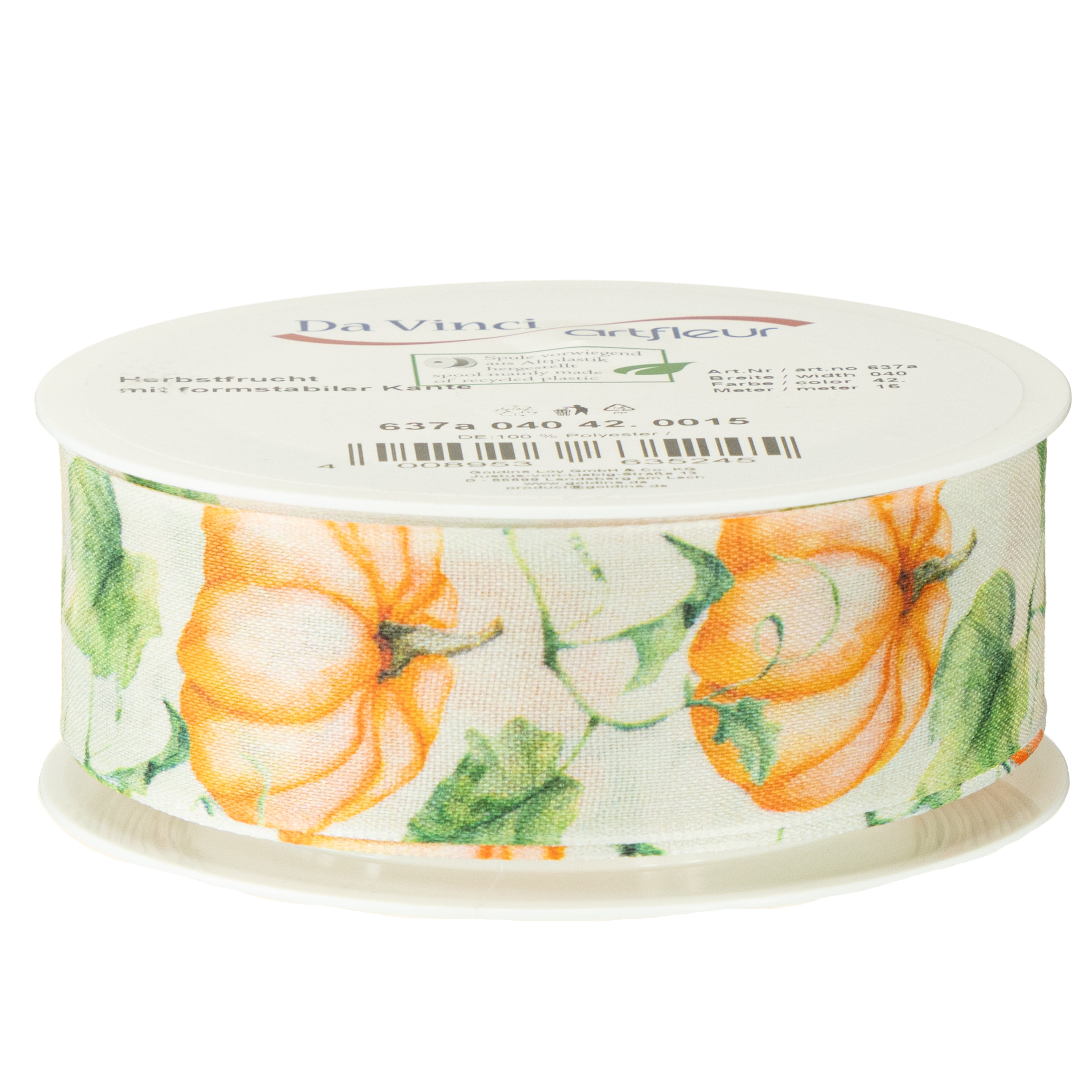 A szalagra részletes sütőtök motívum van nyomtatva. A levelek és indák festői elrendezésben helyezkednek el a narancssárga őszi gyümölcs körül. A díszszalag is minőségi terméknek bizonyul a mérettartó szegélynek köszönhetően.