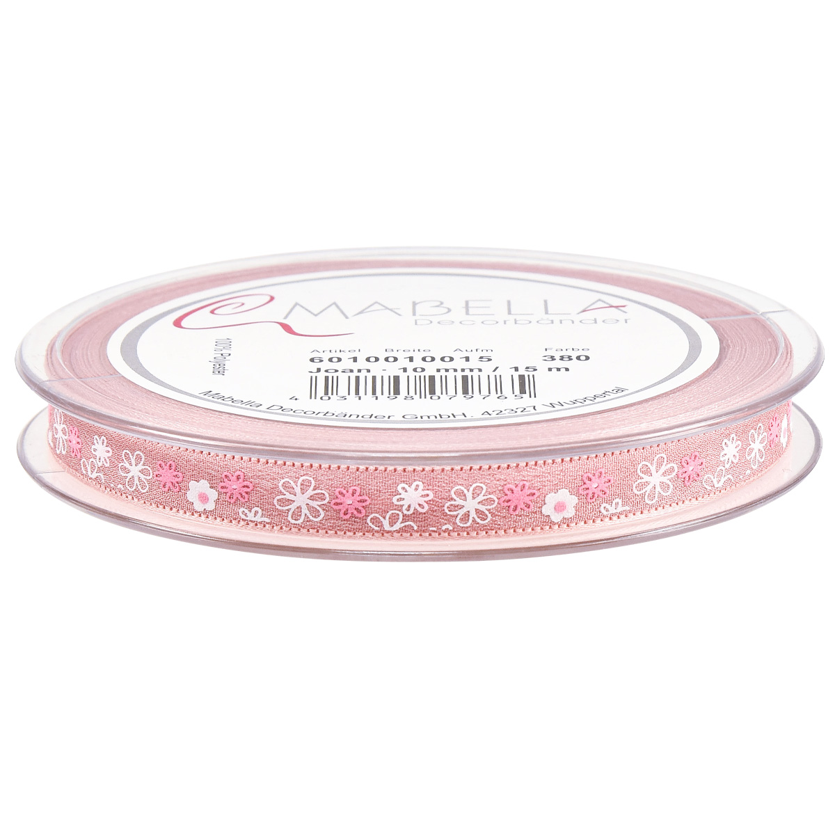 A rózsaszín és fehér virágokkal díszített szalag kiváló minőségű poliészterből készült. A díszszalag körülbelül 15 méter hosszú és körülbelül 10 milliméter széles. Az ajándék szalagot praktikus műanyag tekercsben szállítjuk.