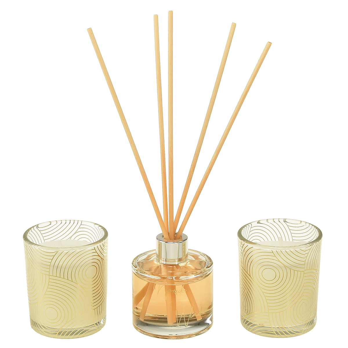 A szobai illatrudakból és vaníliás jegyű illatos gyertyákból álló készlet ideális ajándékozáshoz vagy dekorációhoz otthon, szállodában vagy a wellness részlegben.
