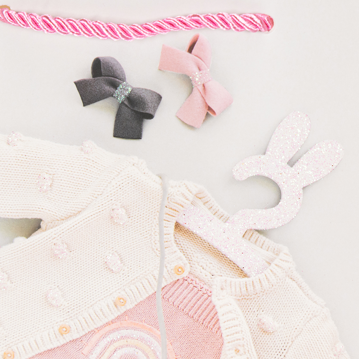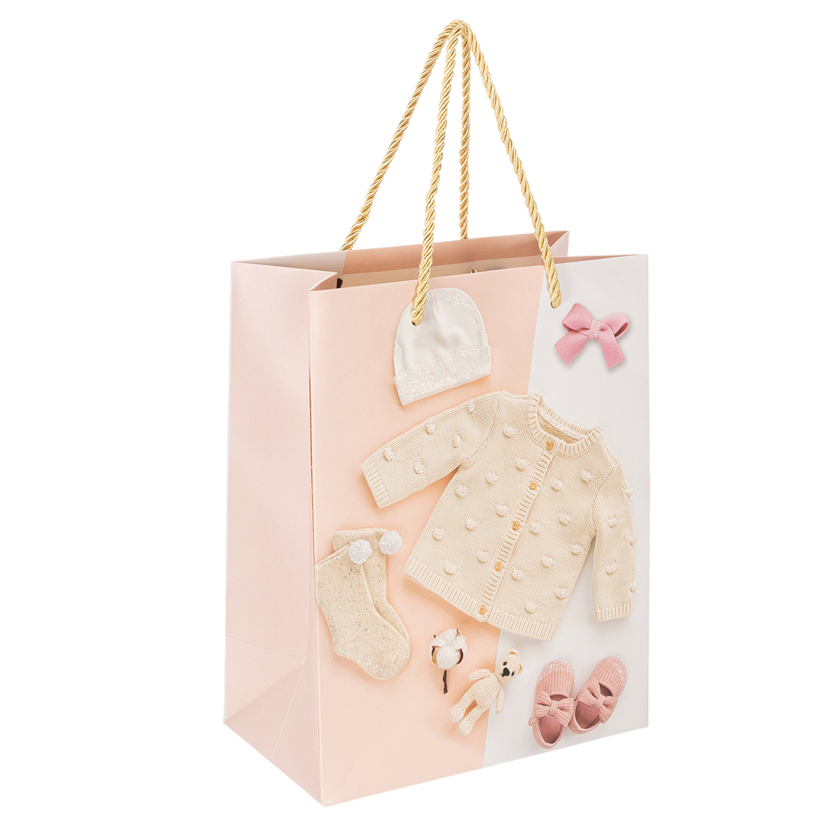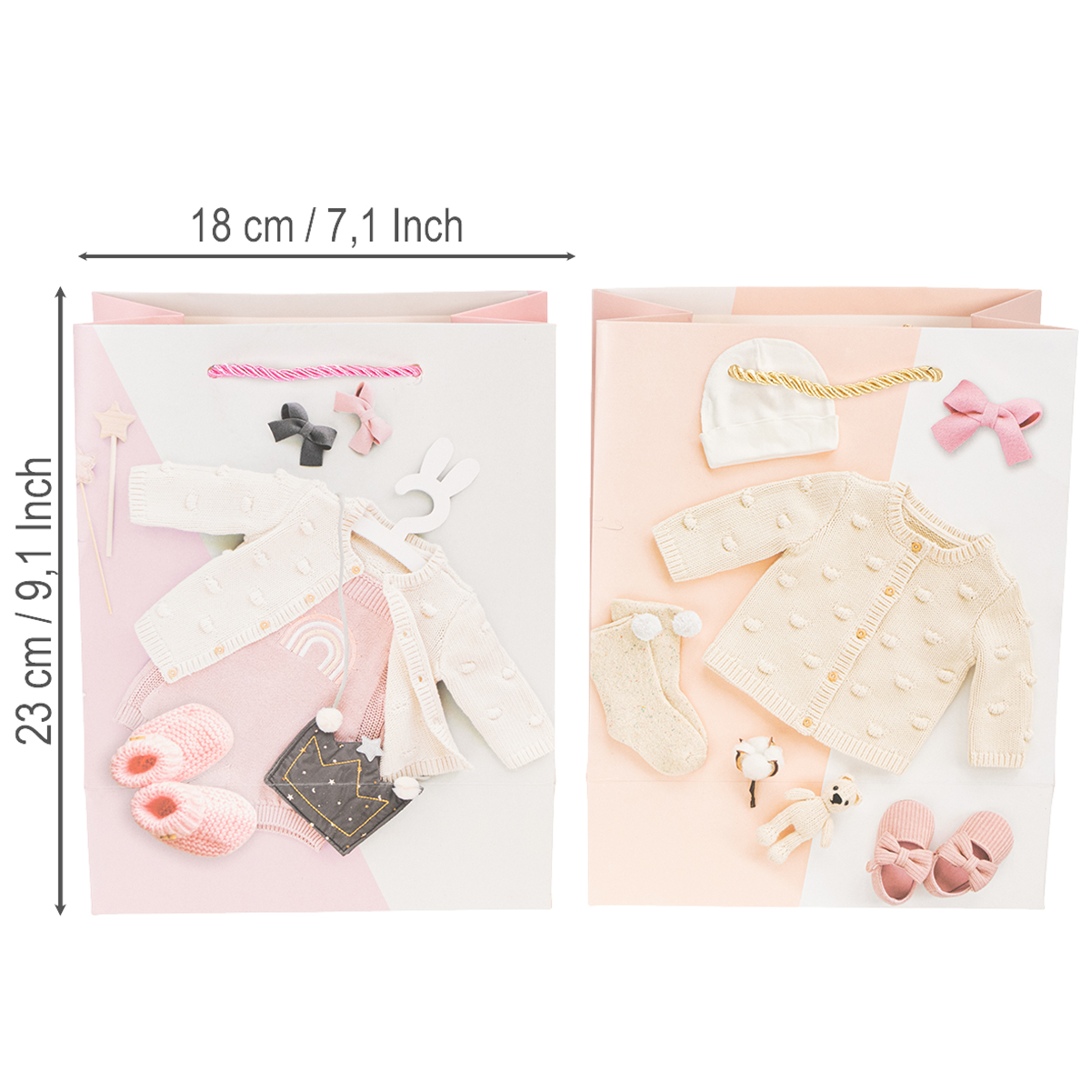 Az ajándéktáskák változatos kialakításúak, kardigánokkal, babacipőkkel, cumisüvegekkel és sok más aranyos kiegészítővel a babák számára. A papírzacskók csillogó effektusai kiemelik a részleteket, és extra varázslatot kölcsönöznek az ajándékcsomagolásnak.