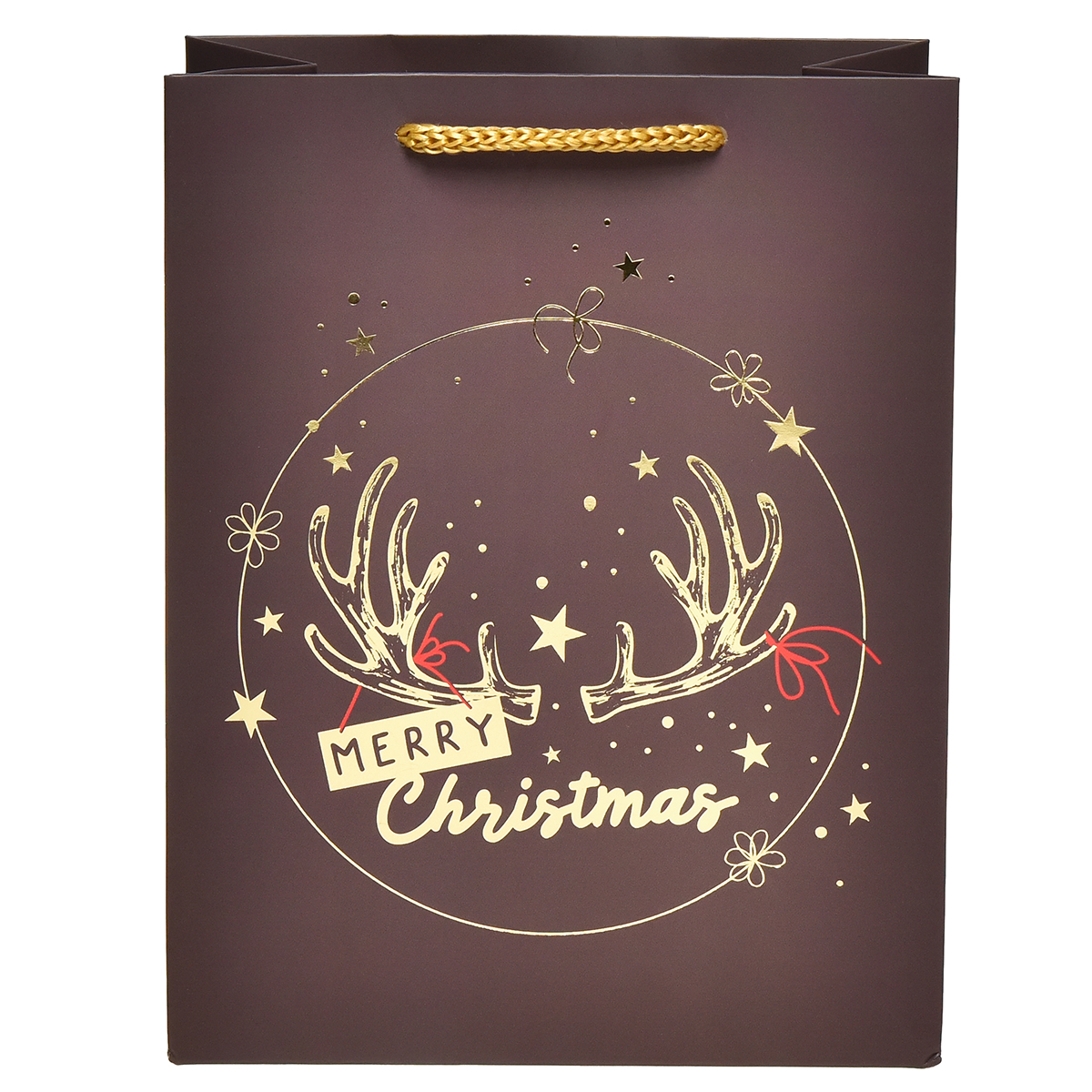 - Barna karácsonyi ajándéktáska arany agancsos illusztrációval