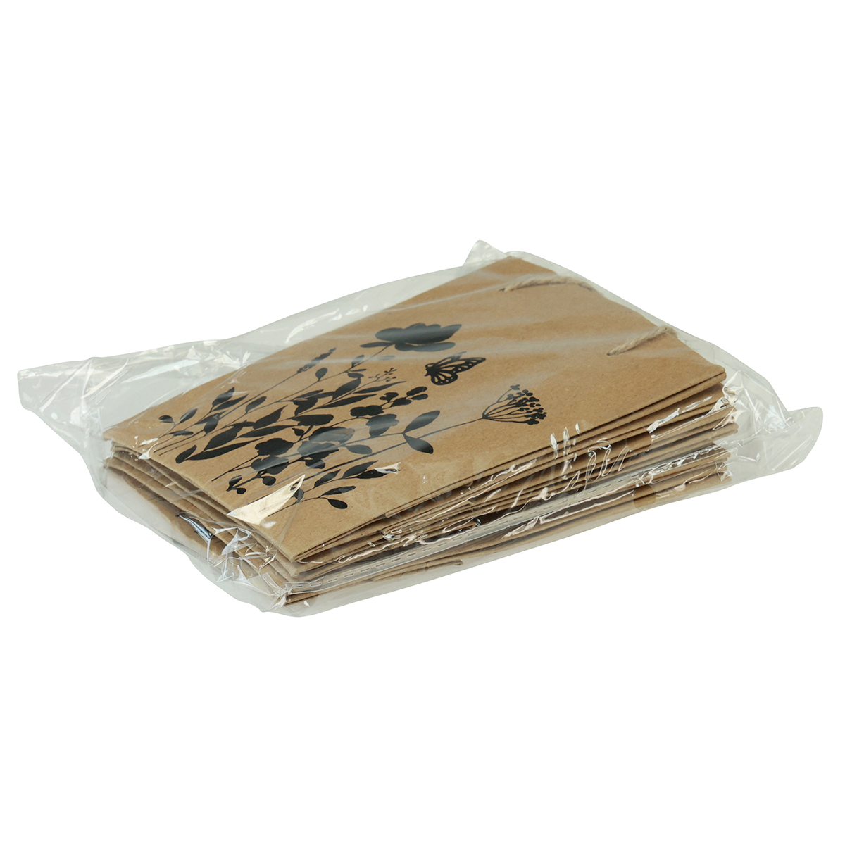 Mélyfekete és papírkivágások stílusában a rét sziluettjei kifejező réti virágokat és pillangókat mutatnak. A két hosszú juta fogantyú tovább erősíti a mini ajándéktáska rusztikus megjelenését. A hátlap nem nyomtatott, és például címkével vagy üdvözlő üzenettel díszíthető.