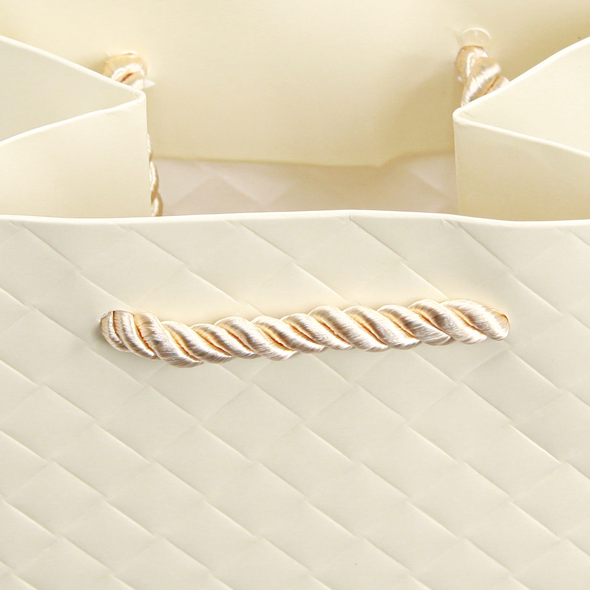 Az ajándéktáska robusztus krémszínű kartonból készült, amelybe csekkeket domborítottak a gyönyörű bőr megjelenés érdekében. Két fonott szatén szalagból készült hurok megkönnyíti a táska hordozását.