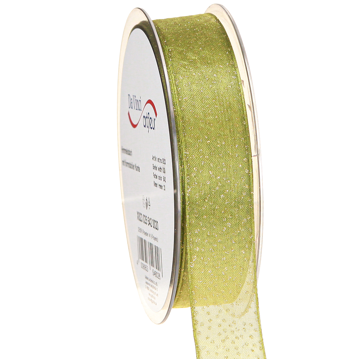 A világoszöld, csillogó pöttyös karácsonyi szalag hossza körülbelül 20 méter, szélessége pedig körülbelül 25 milliméter. 59% poliészterből és 41% poliamidból áll. A selyemszalag egy praktikus, újrahasznosított műanyag tekercsen érkezik.