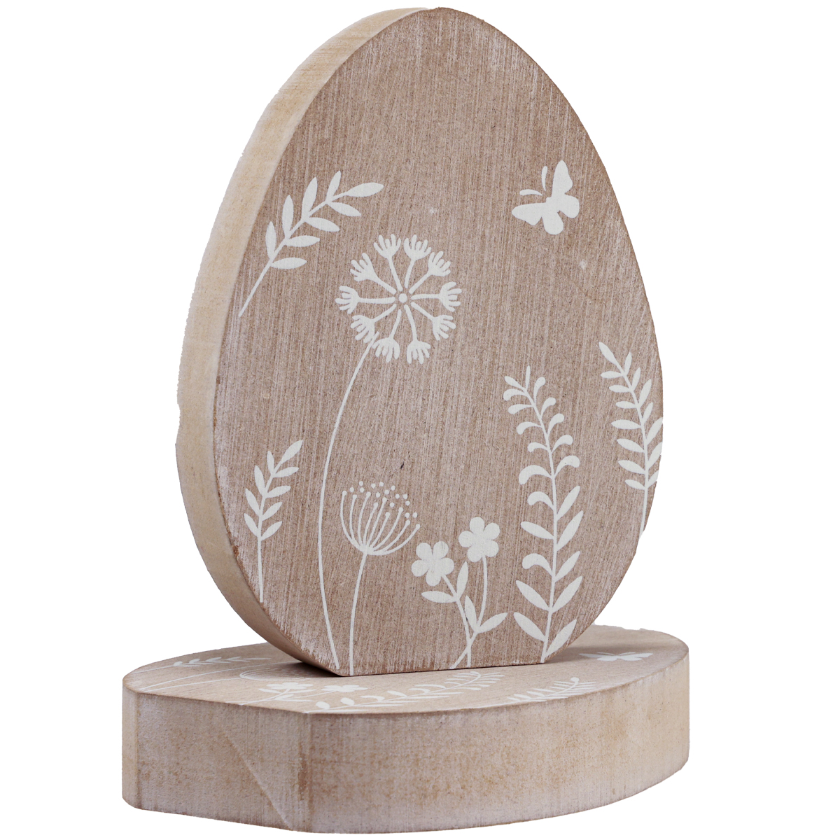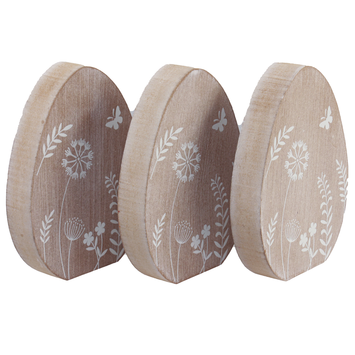 Ez a húsvéti dekoráció a hagyományos elemeket a modern dizájnnal ötvözi, így időtlen asztali dekorációt alkot. A három 14,5 centiméter magas fa húsvéti tojás igazi szemet gyönyörködtető minden húsvéti dekorációhoz. A természetes fa tónusa a finom fehér virág- és pillangómintával kombinálva tavaszias hangulatot kölcsönöz szobájának. A lapított aljának köszönhetően rendkívül praktikus állványok, és rugalmasan beilleszthetők a szoba kialakításába. Minden fából készült tojás tökéletes hangulatos jelenet létrehozásához más húsvéti dekorációs elemekkel kombinálva.