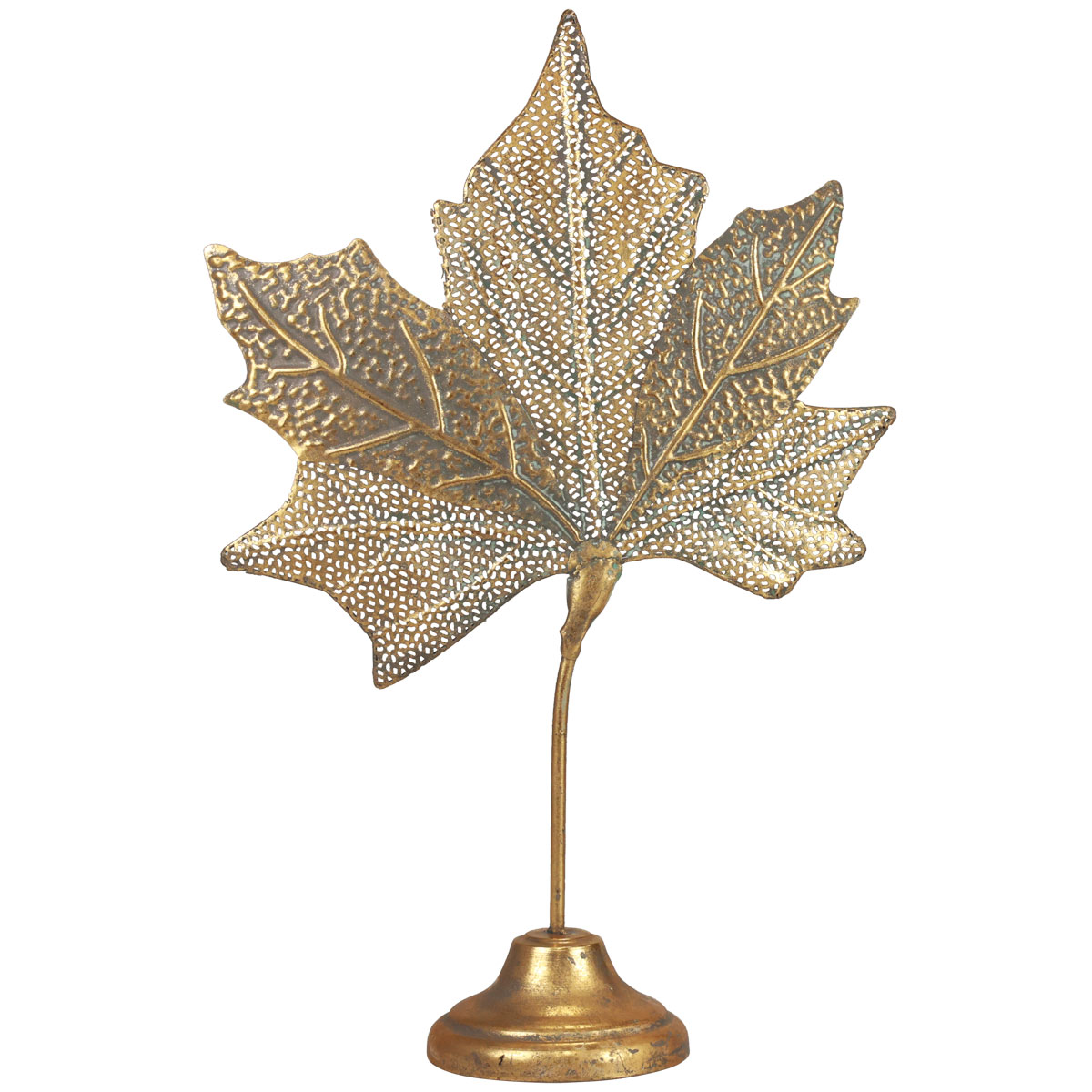 Az aranyszínű fémből készült őszi levél körülbelül 58 centiméter magas. – Kínálatunkban a juharlevelet fali dekorációként gyertyatartós változatban is megkaphatja.