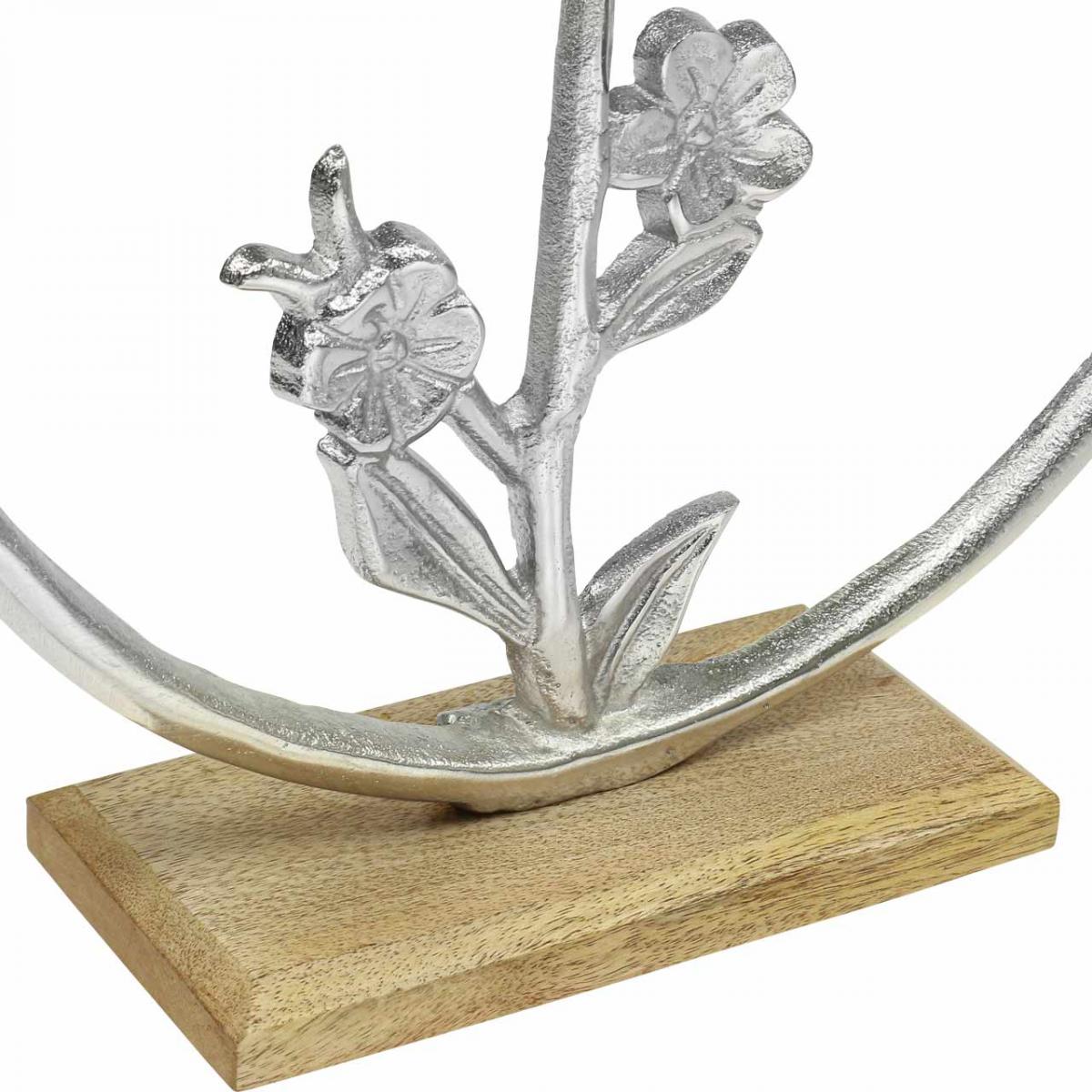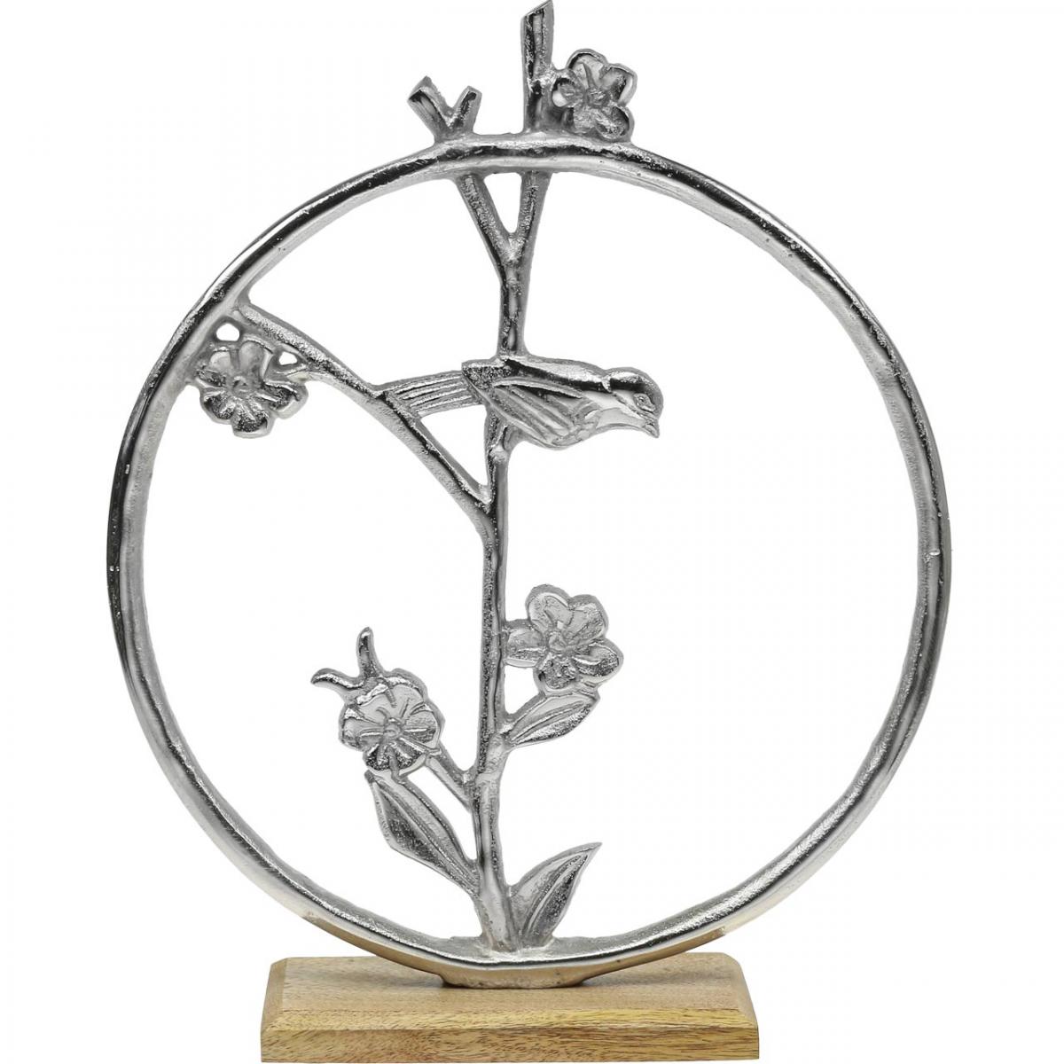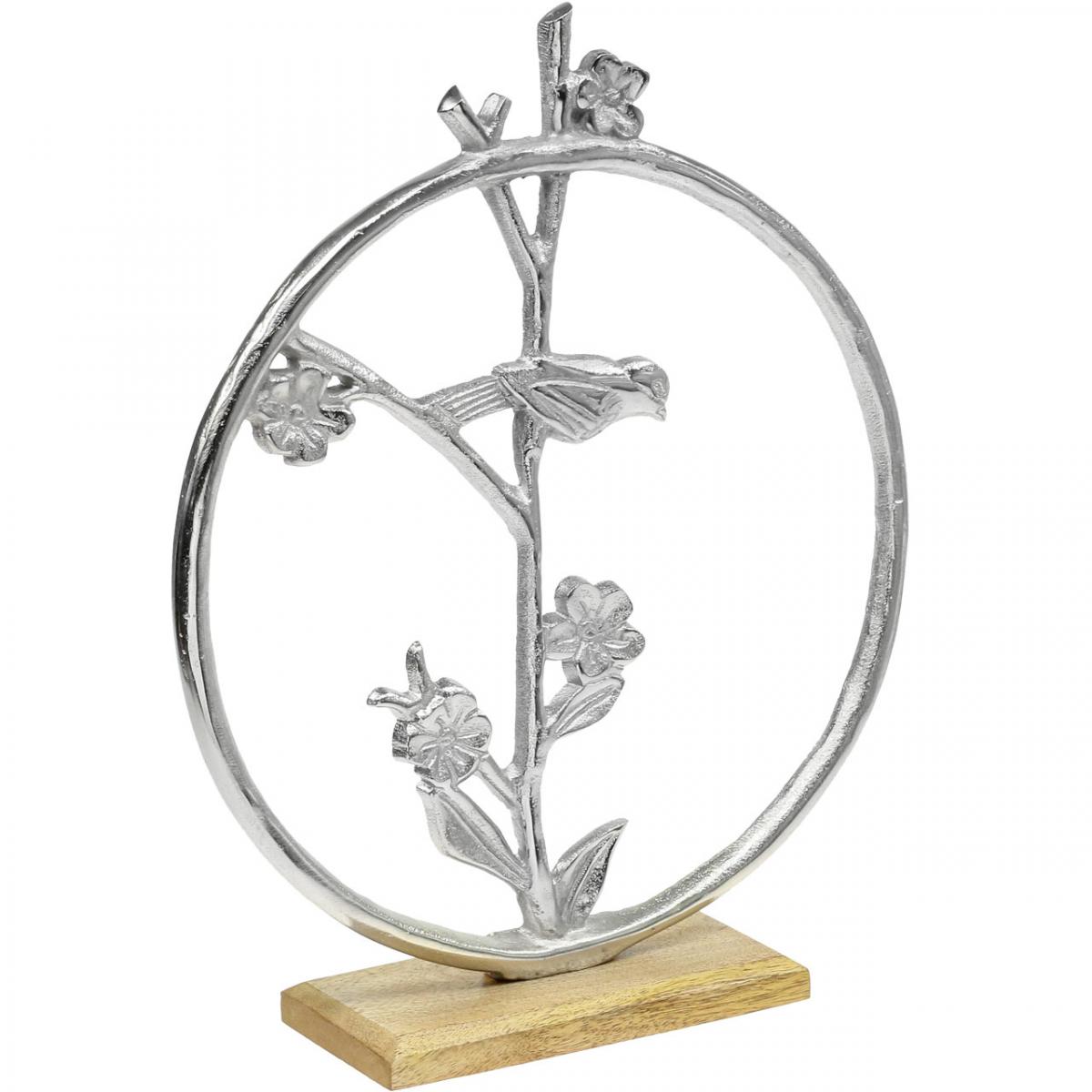 Az ezüst színű madárdíszítésű díszgyűrű mangófából készült stabil talppal. Az ezüst fém és a természetes fa összjátéka különösen szép, és vonzó dekorációs eleme a nappalinak!