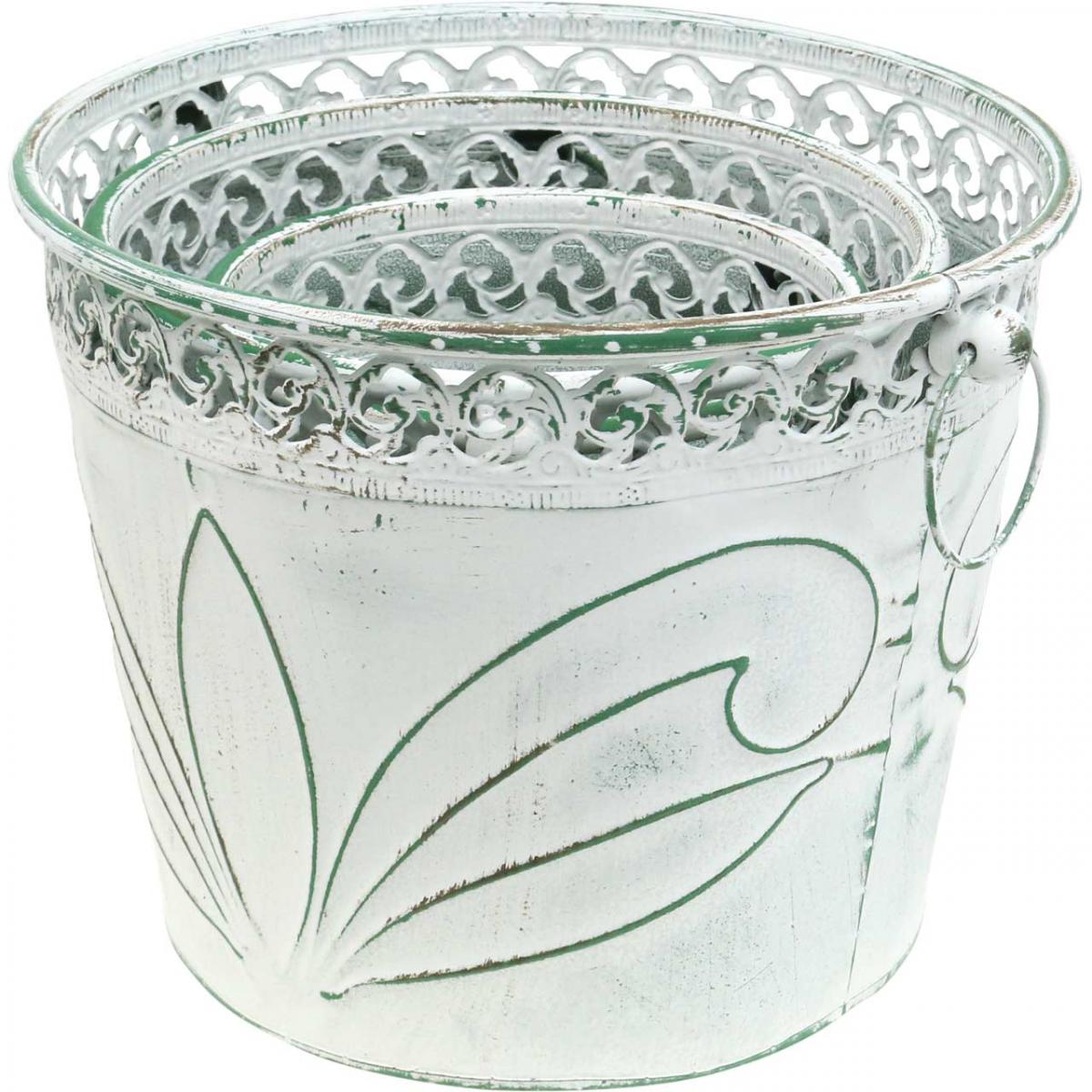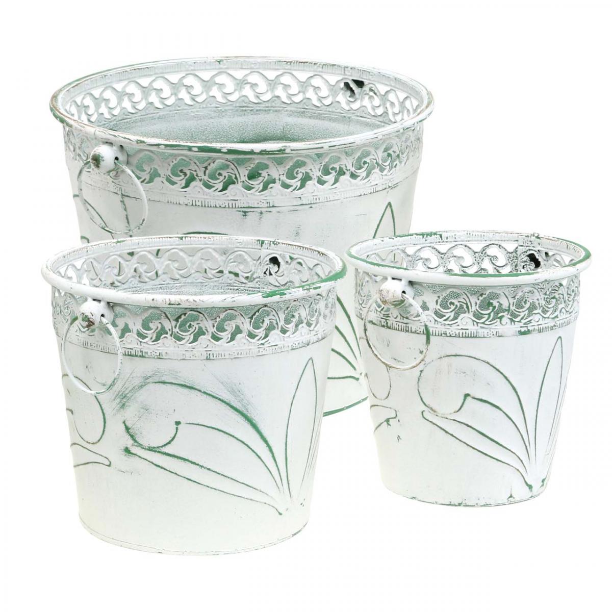 Bádog kád dombornyomással, fogantyús virágtartó fehér, zöld shabby chic H22/19,5/17,5cm Ø25,5/20,5/15,5cm 3 db-os készlet