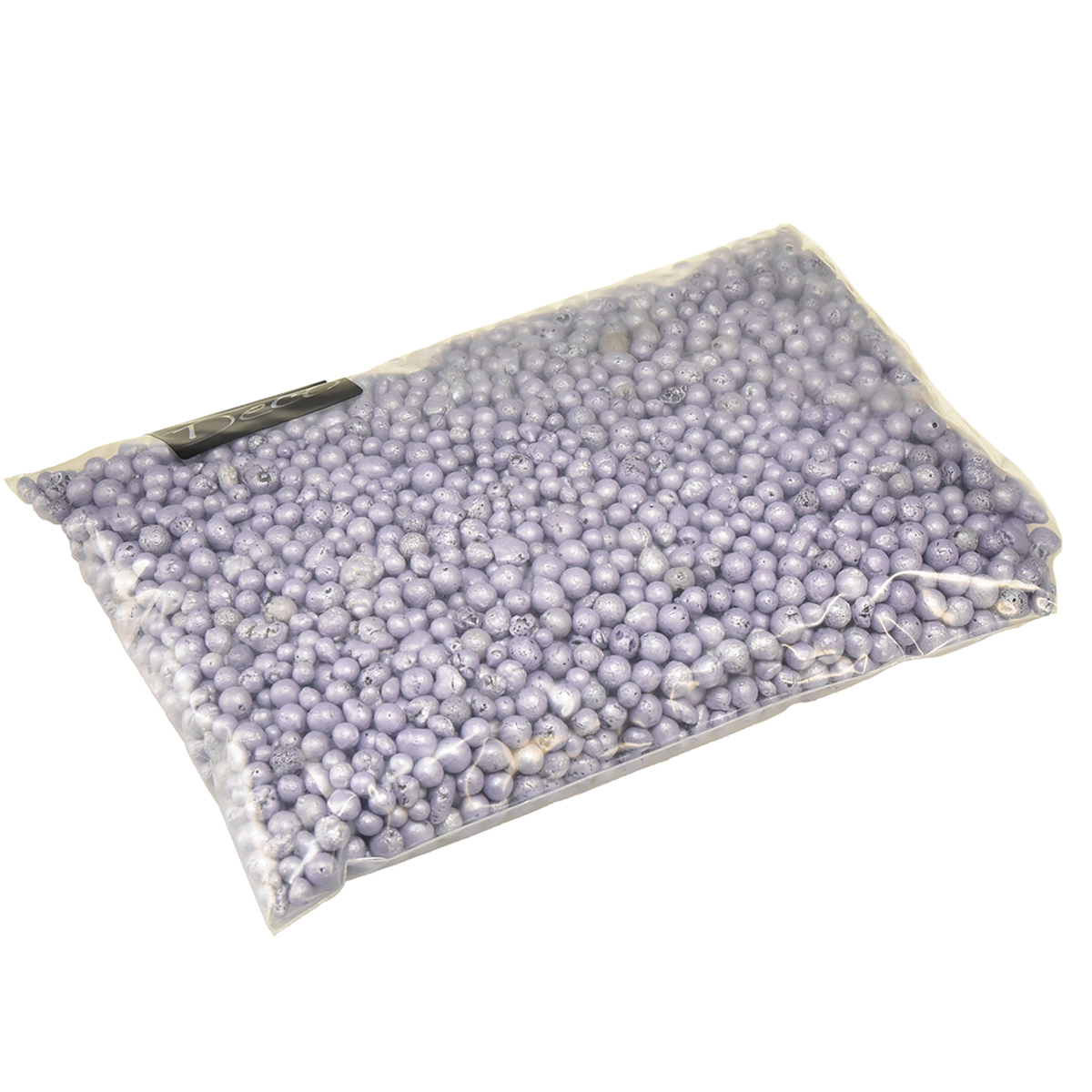 A műanyag zacskó, amelyben a lila briliáns díszítőgyöngyöket kapja, 1 literes, a granulált gyöngyök körülbelül 4 és 8 milliméter méretűek.