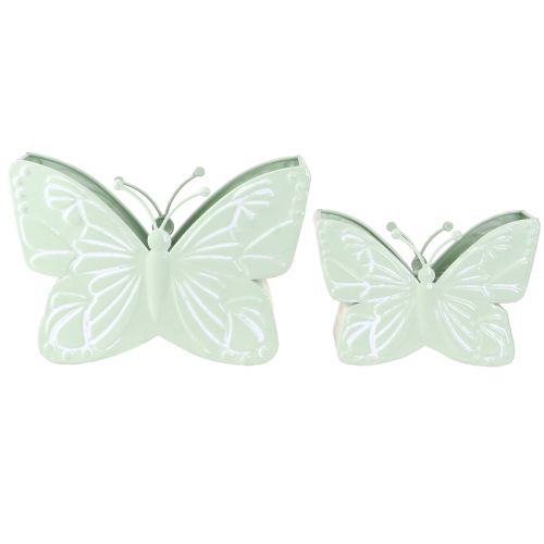 Adjon egy csipetnyi vintage bájt tavaszi és nyári dekorációjához az elbűvölő, mentazöld pillangós fém virágtartóval. Ezek a művészien megtervezett fém virágcserepek a funkcionalitást játékos dizájnnal ötvözik, amelyek tavaszi virágpompában varázsolják belterét vagy erkélyét. Minden készlet két különböző méretű virágcserepet tartalmaz finom mentazöld színben, elegáns, fehérre meszelt vintage kivitelben. Az edényeket pillangó formájúra tervezték, így egyedülállóan vonzzák a szemet. Az igényesen kidolgozott szárnyak és a filigrán dizájn kiemeli a kopott elegáns stílust, amely ideális a nosztalgikus belsőépítészeti koncepciókhoz. Akár a teraszon, akár az erkélyen vagy a nappaliban, ez a pillangós dekorációs készlet egy műalkotással és a természettel gazdagítja környezetét. Fedezze fel a hozzáillő díszítőelemeket, mint a finom szárított virágok vagy más mentazöld fémdíszek a Floristik24-nél, hogy teljessé tegye az összképet.