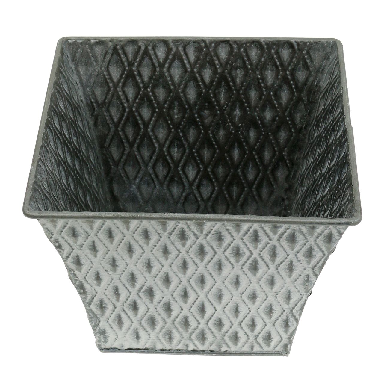 A négyzet alakú, gyémántmintás cinkedény széle körülbelül 18,5 centiméter. Magassága körülbelül 15 centiméter.