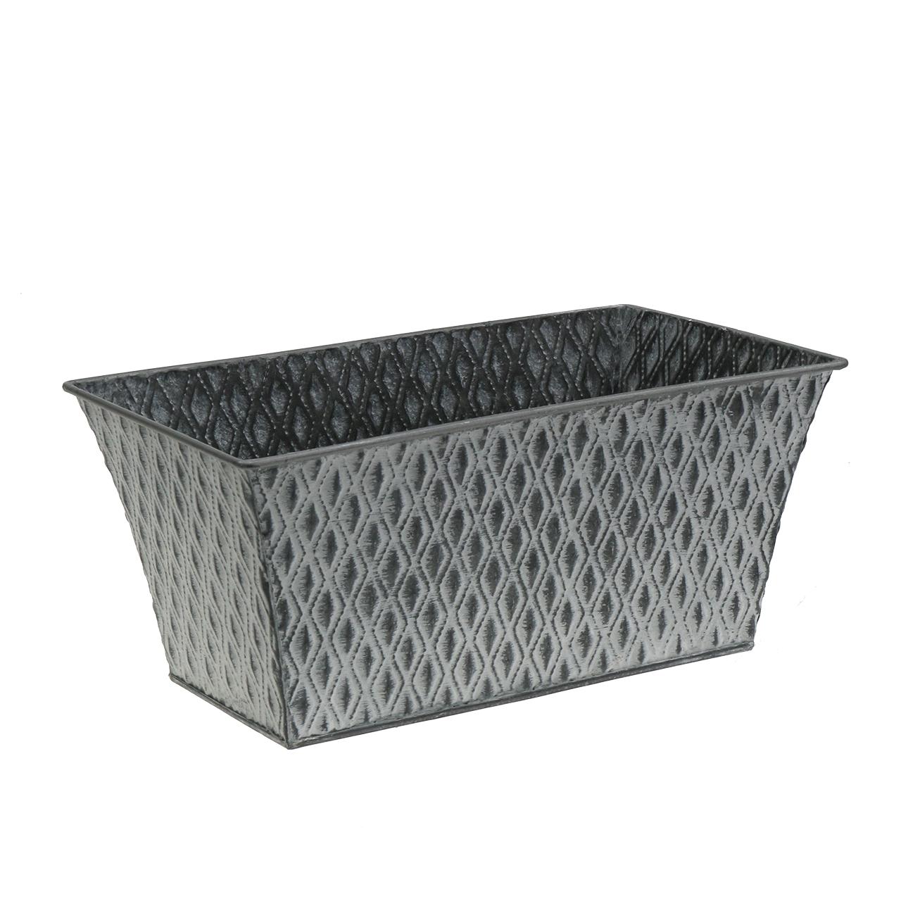 A téglalap alakú, gyémántmintázatú cinkedény körülbelül 22 x 12 centiméteres. Magassága körülbelül 8,5 centiméter.