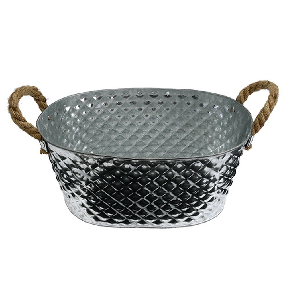 A fehérre meszelt gyémántmintával és kötélfogantyúkkal ellátott ovális cink tál mérete 31 x 20 centiméter, magassága körülbelül 15 centiméter. Ültetőnek és tárolásra is alkalmas.