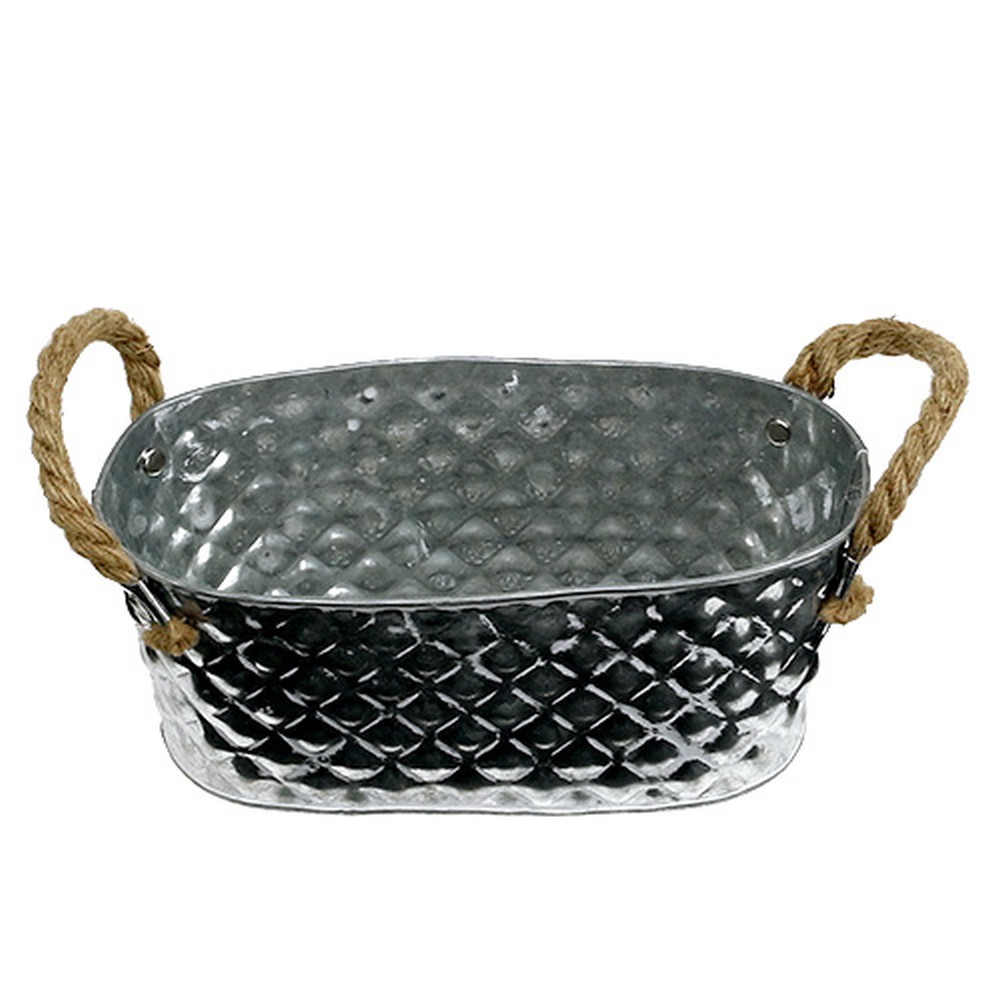 A klasszikus kialakítású, ovális horganytálca ideális ültetésre és díszítésre. Az ültetőtálnak két natúr színű lenből készült fogantyúja is van a hosszúkás oldalán, amelyek csodálatosan harmonizálnak a fém fényes ezüstjével. Ezen kívül a tál felületét a fémbe ügyesen beleütött rombuszforma díszíti. Ebből a célból a közbülső pontokat nagyon enyhén festették fehér festékkel, hogy a gyémánt formák jobban kitűnjenek és jobban láthatóak legyenek.