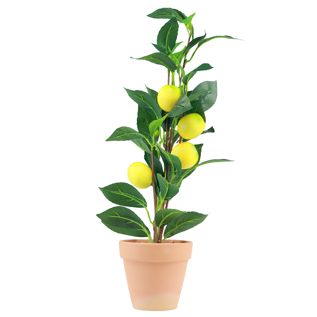 Öt sárga-zöld műcitrom és mélyzöld levél lóg a cserepes citromfán. A valódi kavicsos kis terrakotta ültetőben a fa kétszer olyan valósághűnek tűnik.