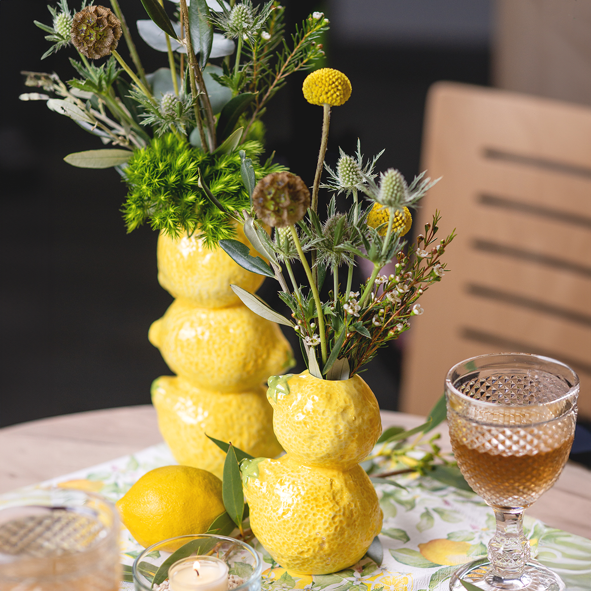Üzletünkben más mediterrán ihletésű, citrom motívumú kerámiákat is találhat. Várd a nyarat sárga színben ezzel az asztali vázával!