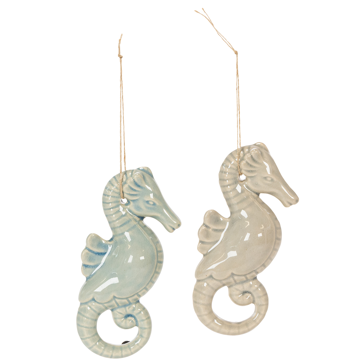 Hozd el a tenger varázsát otthonodba! Ezek a stílusos, csikóhal alakú, függő kerámia figurák egy csipetnyi tengeri eleganciát visznek nappalidba és fürdőszobádba. Kiváló minőségű, kék és világos szürke árnyalatú kerámiából készültek, ezek a finom figurák nyári bájt árasztanak, és a napsütötte partok és a nyugodt óceáni hullámok képét idézik fel. 15 centiméter magasak, 7 centiméter szélesek és 2 centiméter mélyek, így visszafogott, mégis feltűnő kiegészítői lehetnek személyes oázisodnak. Ideális beltéri vagy védett kültéri terekbe, ez a tengerészeti dekoráció egy csipetnyi tengerparti nyaralást visz bármely otthonba!