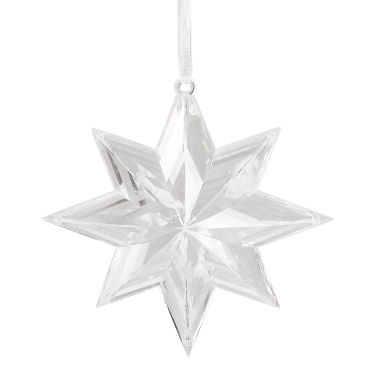 Az átlátszó csillag kifinomult kialakítása nyolc, egyenletesen elosztott ponttal rendelkezik. A tetején egy finom, enyhén csillogó szalag található, amellyel felakaszthatod a csillagot.