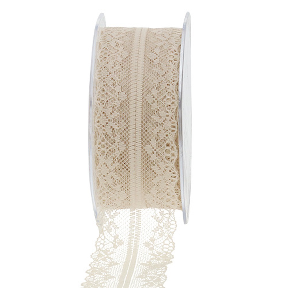 A karamellszínű csipkeszalag szélessége körülbelül 40 milliméter, hossza pedig körülbelül 20 méter. 95% poliészterből és 5% poliamidból áll, és praktikus műanyag orsón szállítjuk.