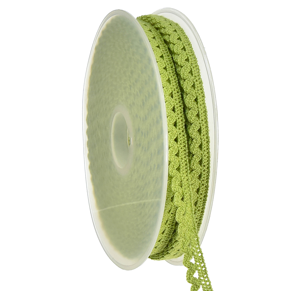 A horgolt csipkével díszített zöld díszszalag szélessége körülbelül 9 milliméter, hossza körülbelül 20 méter. A díszszalagot tekercsként kapod egy lapos műanyag orsóra, ahová vékony, ezüst színű tűvel feltűzik.