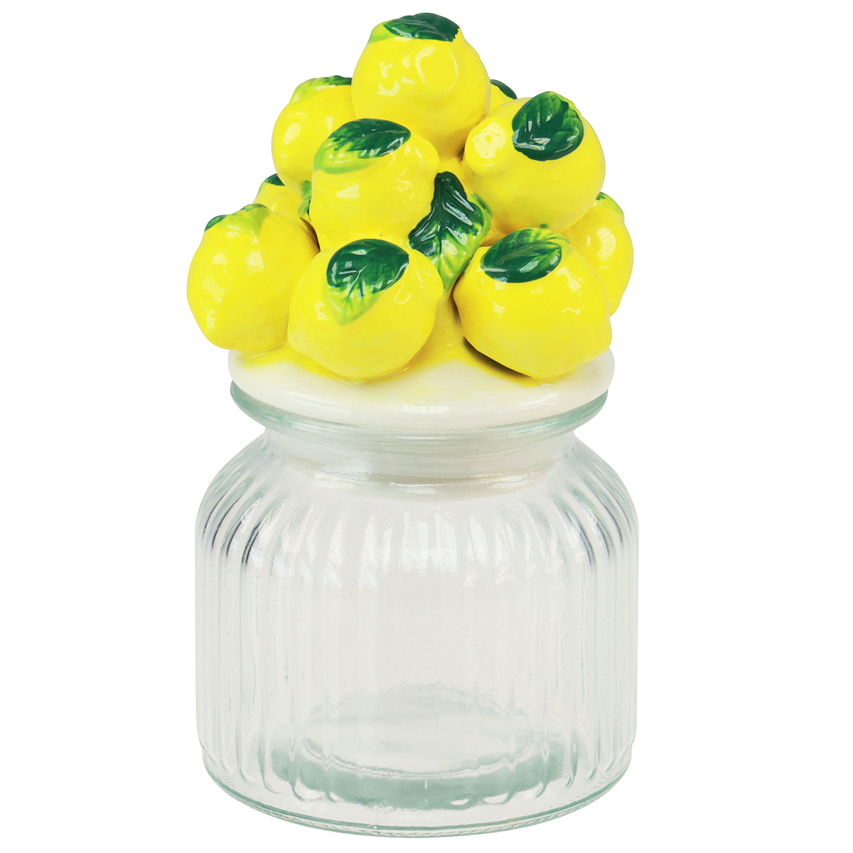 A tárolóedény átlátszó és bordázott. A kerámia fedelet szoborszerűen kialakított citromok és levelek díszítik, és rugalmas műanyag tömítéssel rendelkezik.