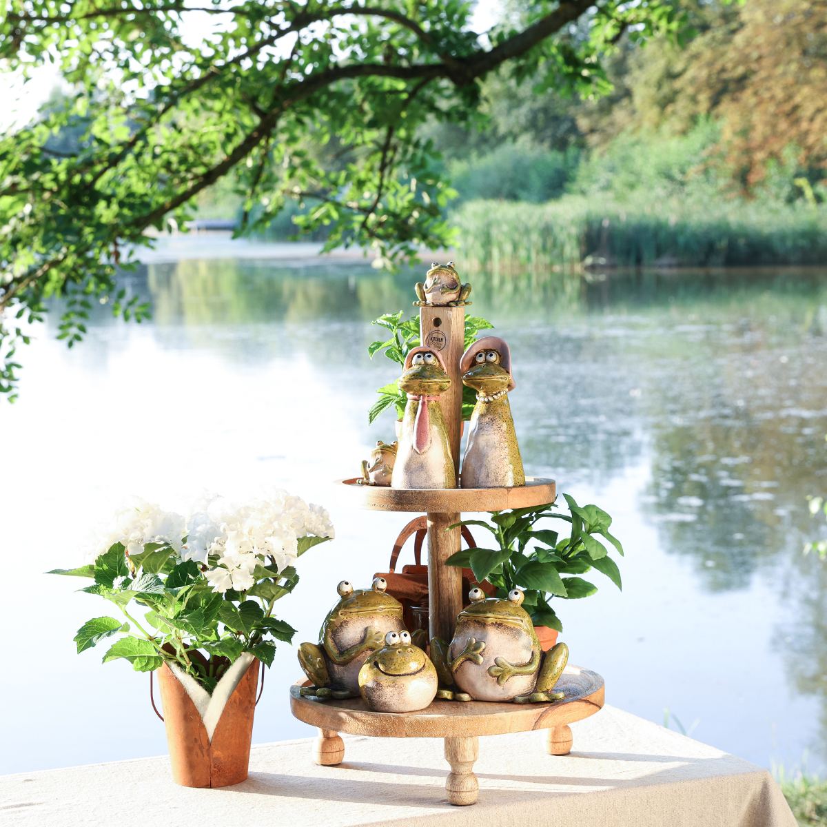 Gazdagítsa nyári dekorációit a bájos dekoratív békával, amely zöld és barna kerámiából készült. Ezek az aranyos kerámia békák játékos, nagy fehér szemükkel és egyedi rozsdás kinézetű részleteivel igazi szemet gyönyörködtetőek. A gondos festés adja a figurák összetéveszthetetlen vintage varázsát. Minden béka egyedi, és nosztalgikus színeket és dizájnt hoz otthonába. Legyen szó asztaldísznek a szabadban, az erkélyen vagy a nappali ablakpárkányának szépítésére - ez a békadekoráció tökéletesen illeszkedik minden rusztikus környezetbe. Merítsen ihletet a harmonikus kombináció más természetes dekorációkkal, és varázsoljon otthonos légkört otthonába.