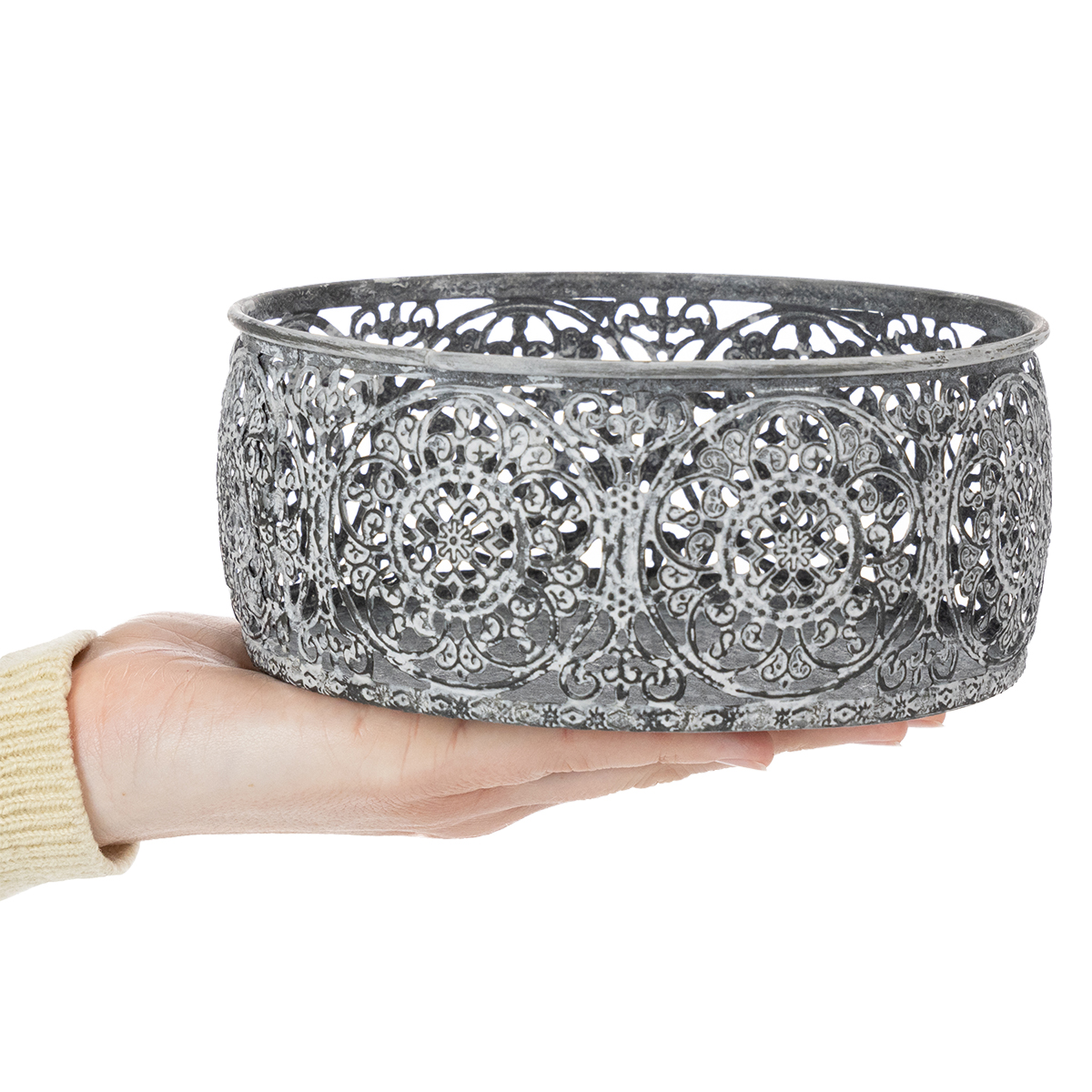 Ezek a virágmintákkal díszített fém dísztálak asztalokat, komódokat vagy tálalószekrényeket díszítenek. A filigrán mélyedések varázslatos díszítéseket hoznak létre a fémhéjak külső oldalán.