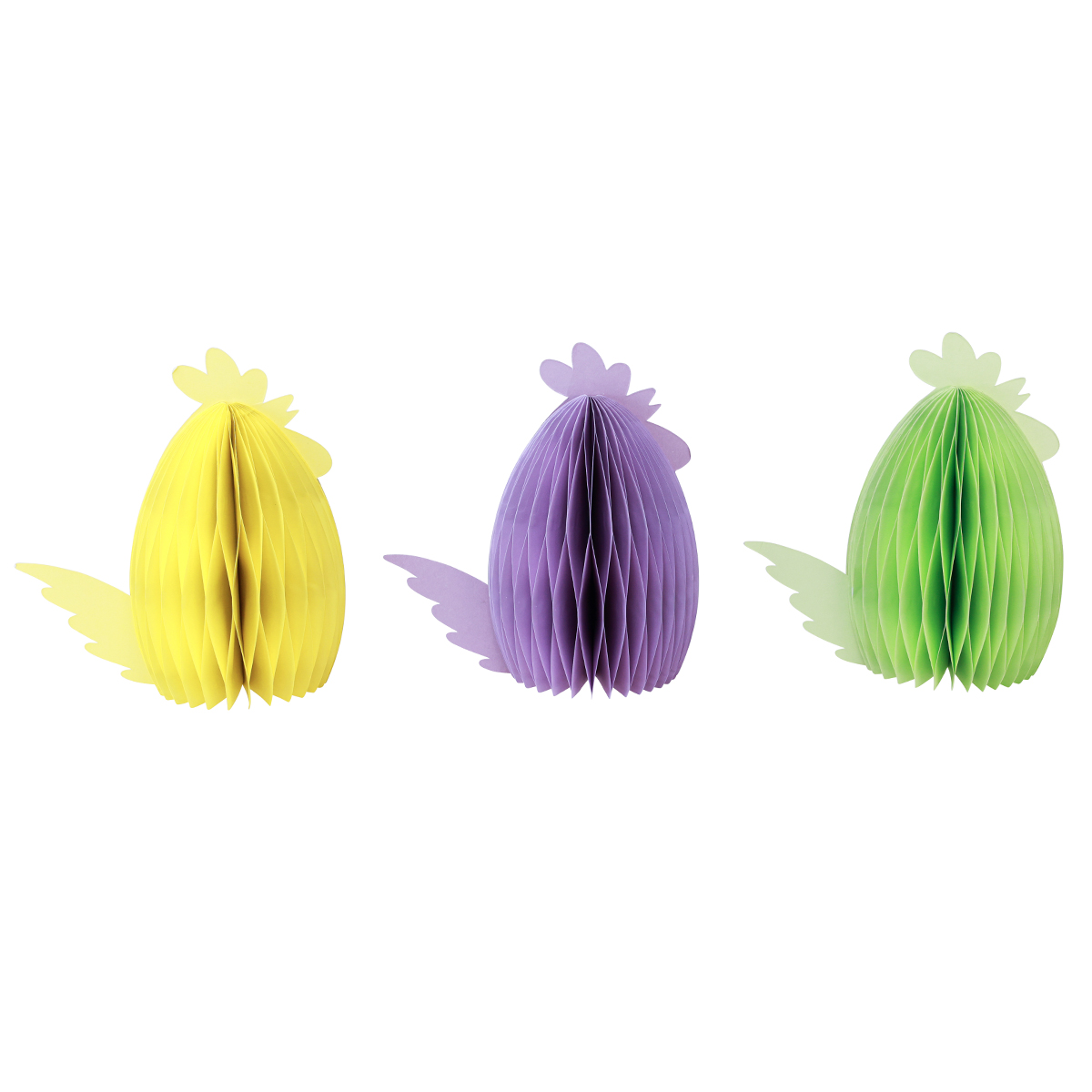 A 3 méhsejt csirke meleg, sárga, lila és világoszöld színeivel friss levegőt hoz a húsvéti dekorációba. Stílusos, papírból készült csirke dekorációként minden ünnepet feldobnak, és gondoskodnak arról, hogy vendégei lelkesen nézzenek ki.