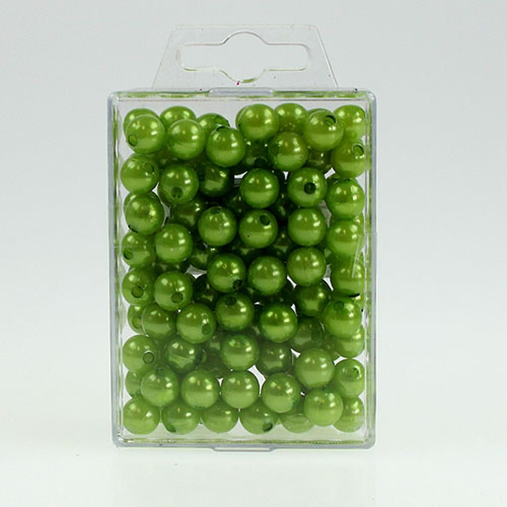 A zöld díszgyöngyök 115 db-ban, könnyen elrakható műanyag dobozban kaphatók. Minden gyöngy körülbelül 10 milliméter átmérőjű; a lyukak átmérője 3 milliméter körül van.