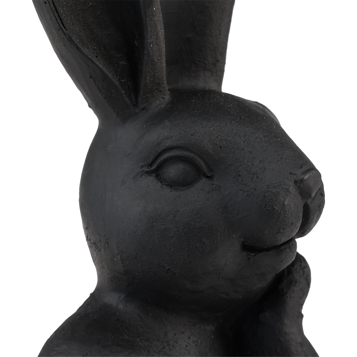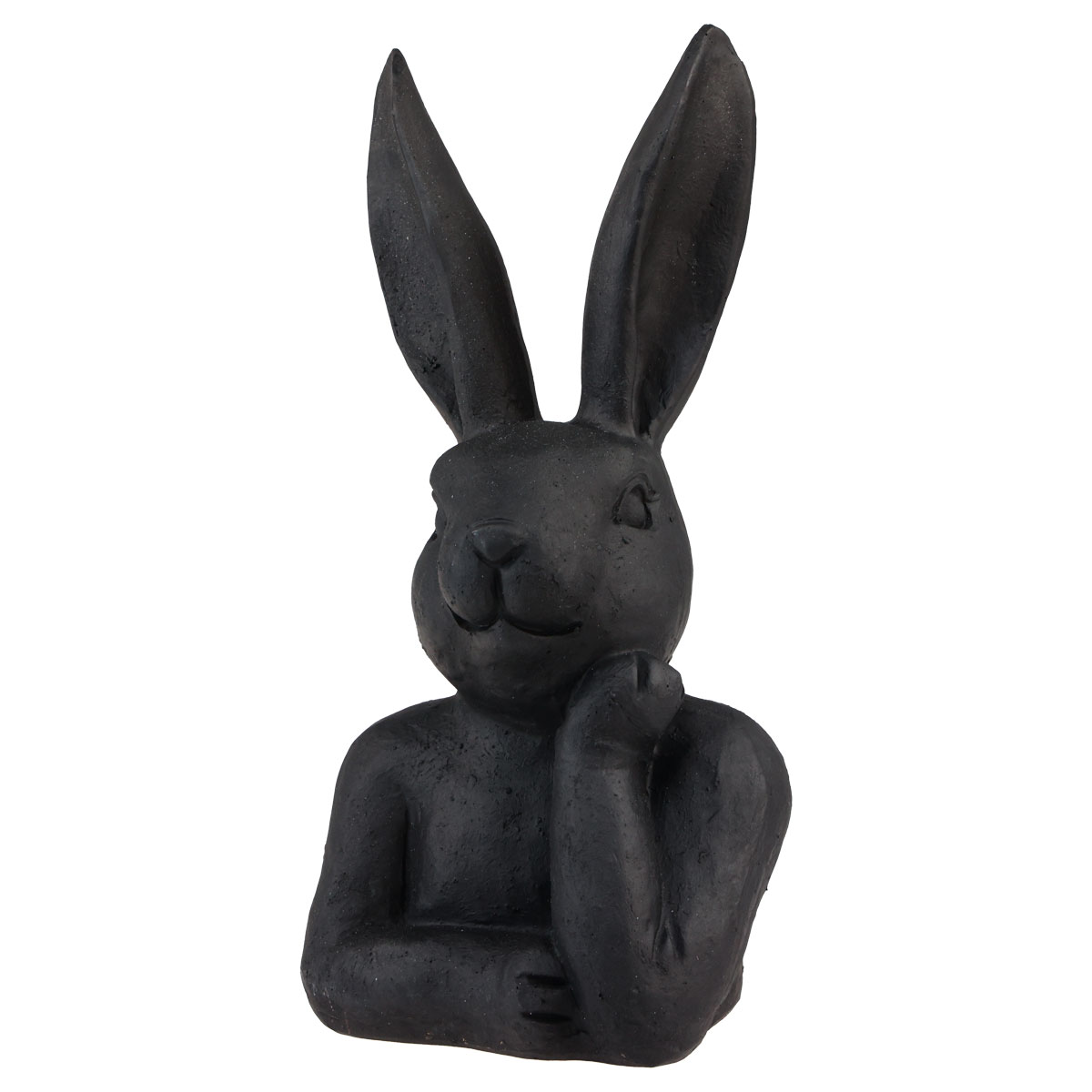 A húsvéti nyuszi gondolkodó póz ellenére mosolyog, és matt feketére van festve. A hosszú fülekkel és a részletgazdag arccal a dekoratív figura nagyon élénknek tűnik. A fekete szín viszont eleganciát kölcsönöz a nyúlnak.
