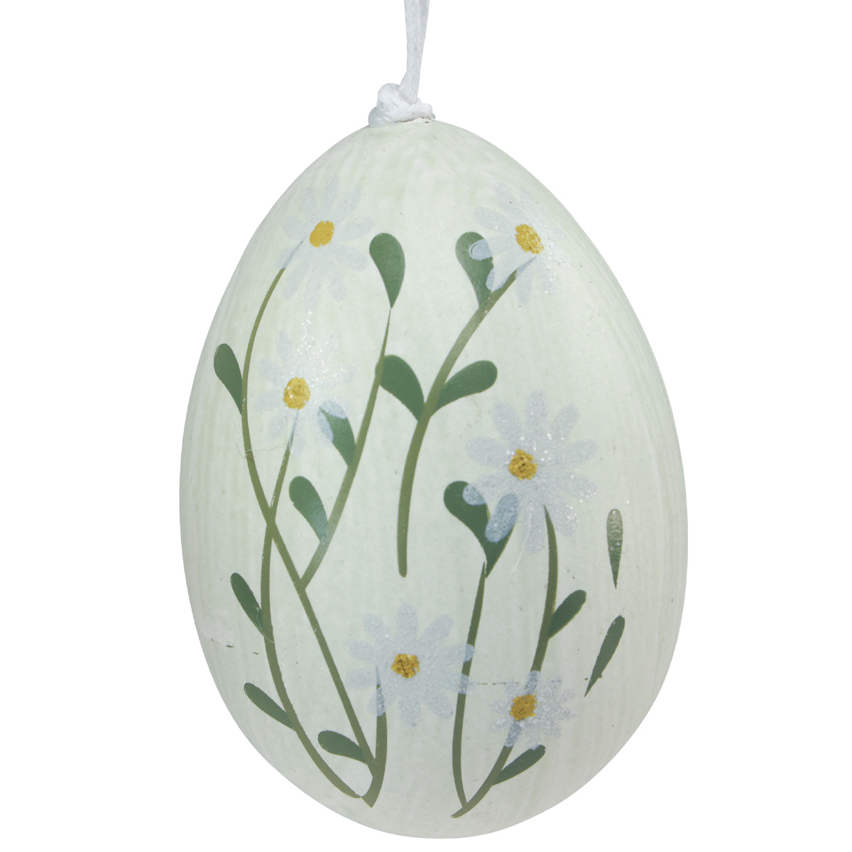 A húsvéti tojásokat három színben márványozzák, és egyik oldalukra különböző virágokkal festik díszítésképpen. Egy krémfehér dísztojást kapsz margarétával, egy mustársárgát fehér virágokkal és egy zöldet, fehér százszorszépekkel.