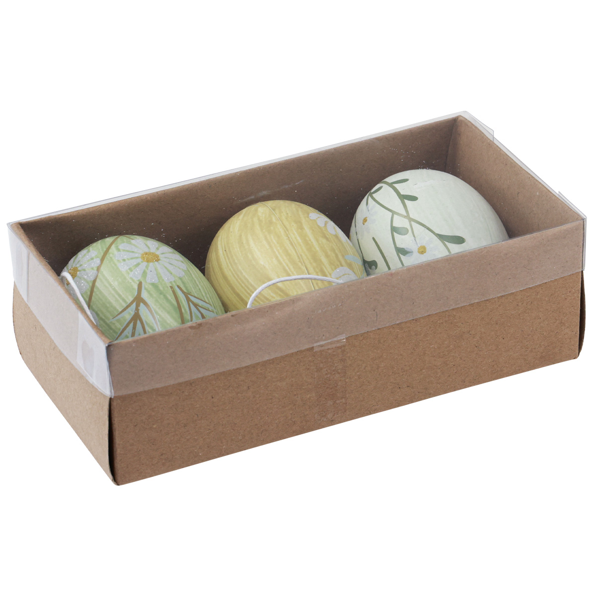 A húsvéti tojások körülbelül 7 centiméter magasak, hármasban, szín szerint rendezve, átlátszó fedelű dobozban.