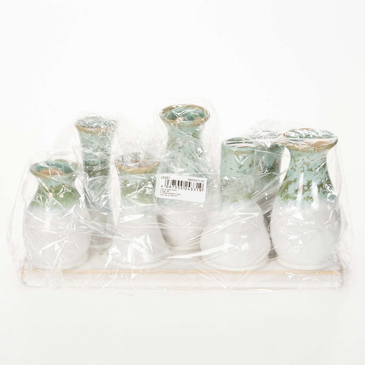 Mikor dobta fel utoljára otthonát átgondolt részletekkel, amelyek különleges hangulatot kölcsönöznek neki? Dekoratív kerámia vázánk, kiváló minőségű tálcán, tökéletes lakberendezési kiegészítő! Ezek a gyönyörű mini vázák lágy zöld és fehér árnyalatokban ötvözik az eleganciát az időtlen egyszerűséggel – tökéletesek egy harmonikus otthonba. A 26 cm hosszú és rusztikus megjelenésű vázák tökéletesen illeszkednek bármilyen helyiségbe, legyen az étkezőasztal, ablakpárkány vagy előszoba.