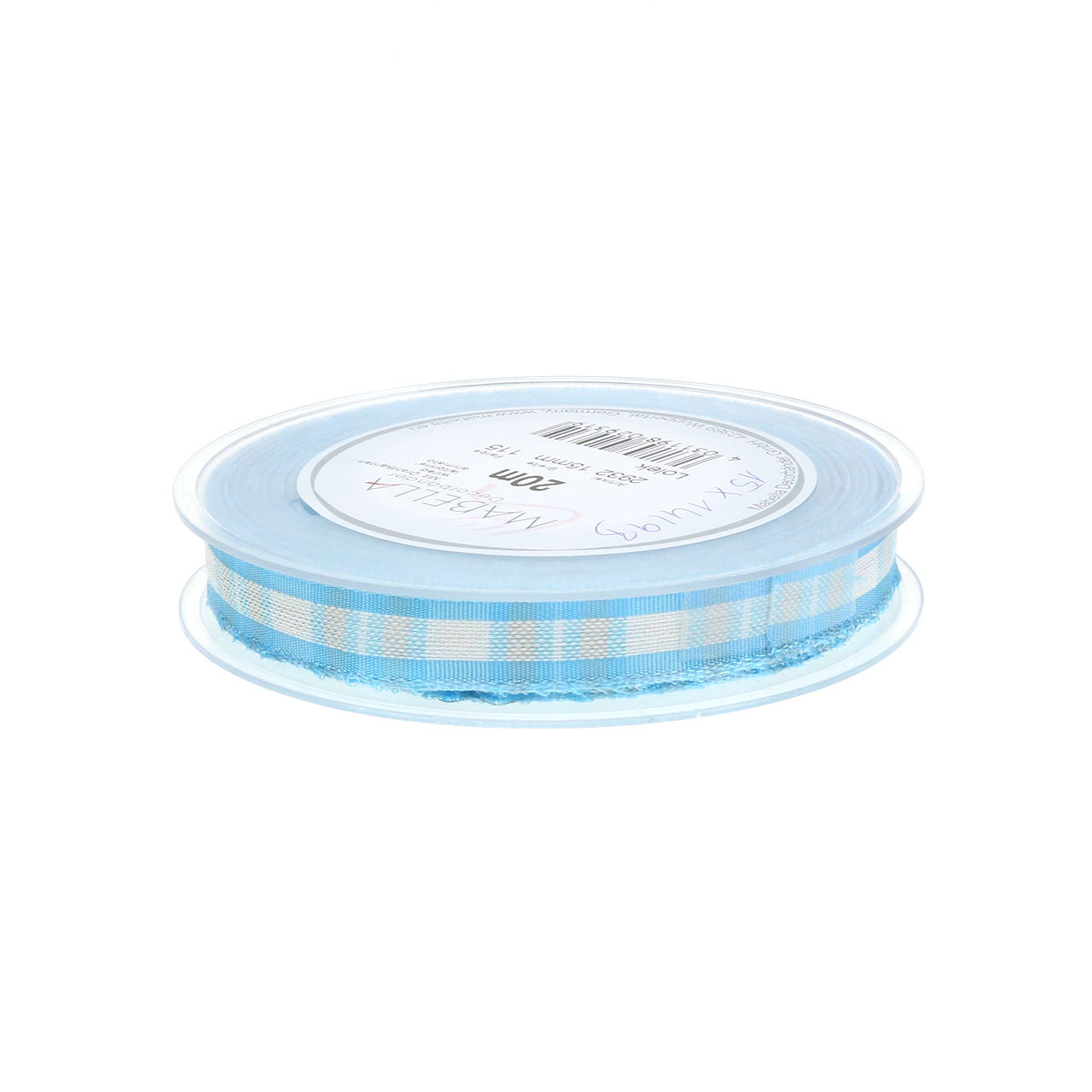 A kék, kockás mintázatú díszszalag drótszegéllyel körülbelül 20 méter hosszú és körülbelül 15 milliméter széles. 60% acetátból és 40% pamutból áll. A huzal éle fémből készült. A szalagot egy praktikus műanyag tekercsre tekerve kapja meg.